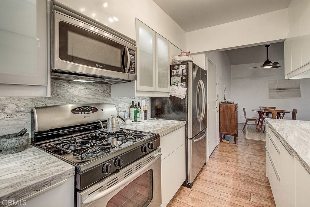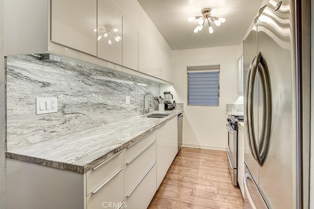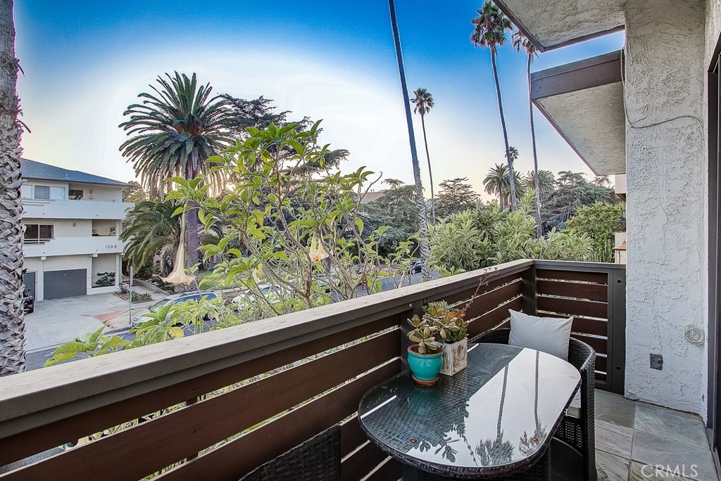 Gorgeous and updated "North of Wilshire" condo. This top floor end-unit is spacious, full of light and quiet. Recently remodeled, the living space features wood laminate flooring, floor to ceiling windows and a sliding glass door to a large west facing balcony where you can enjoy the Ocean breeze. The kitchen is adjacent to the dining nook and was completely redesigned from top to bottom with contemporary grey and white granite, stainless steel appliances and European-style white cabinets. The bedroom has a stylish ceiling fan and a large closet with "Closet World" organization features making it even bigger than it looks. The bathroom has a vanity that is separated from the rest of the room by a door and was also remodeled with modern finishes that maximize style and utility. The complex has a laundry room and secure parking with extra private storage space. Ideally located near the beach, the Wilshire/Montana shopping and dining district , the Third Street Promenade, shopping, dining and in a coveted school district, this condo will sell fast!