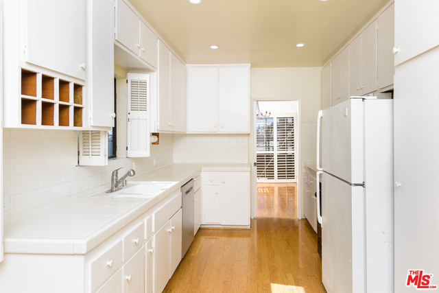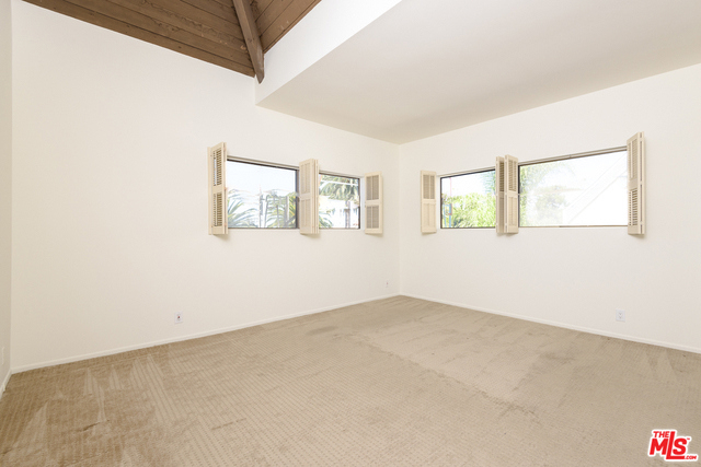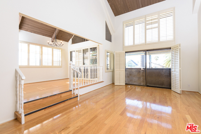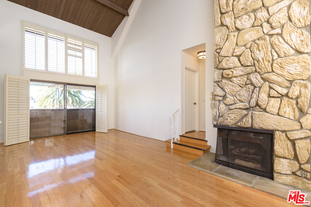 Top floor front facing condo with amazing natural light. Ready to move in or remodel. Lovely step down living room with high vaulted wood beamed ceilings, hardwood floors and fireplace. Sizable dining room leads to outdoor balcony with south west views. Large eat-in kitchen with lots of counter space. Master suite with spa tub and two huge closets. Plantation shutters throughout. Controlled access building with elevator and two side by side parking spaces. Laundry inside unit. Building is currently being renovated.