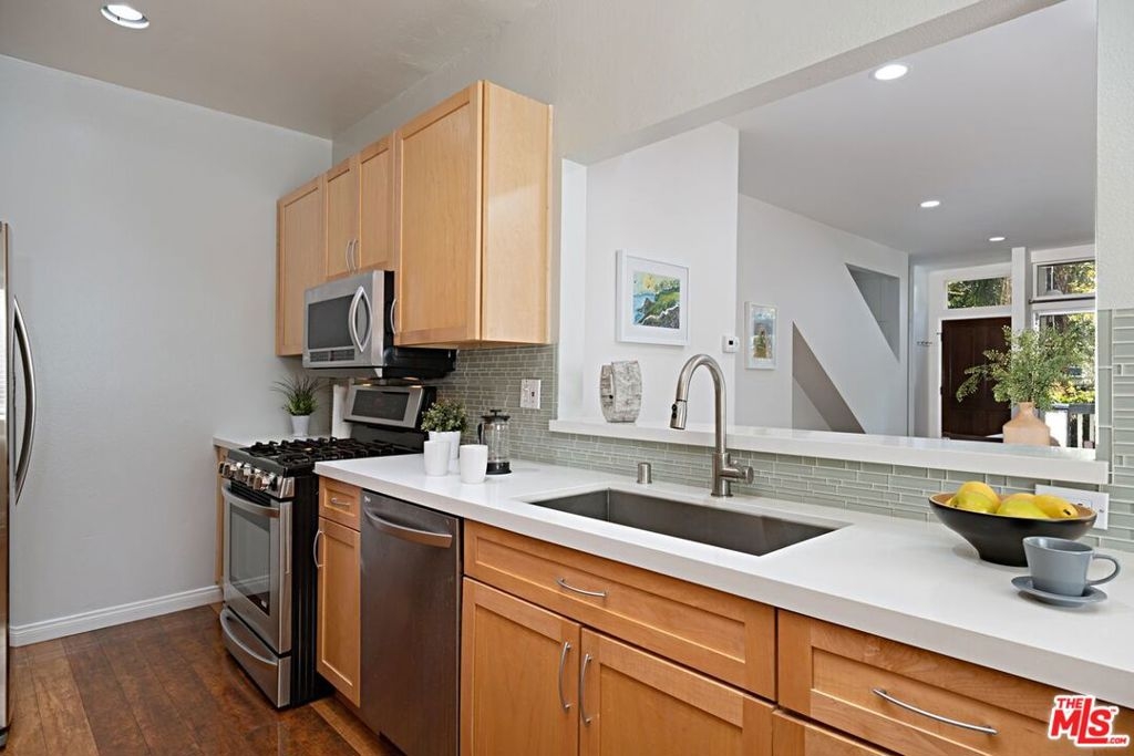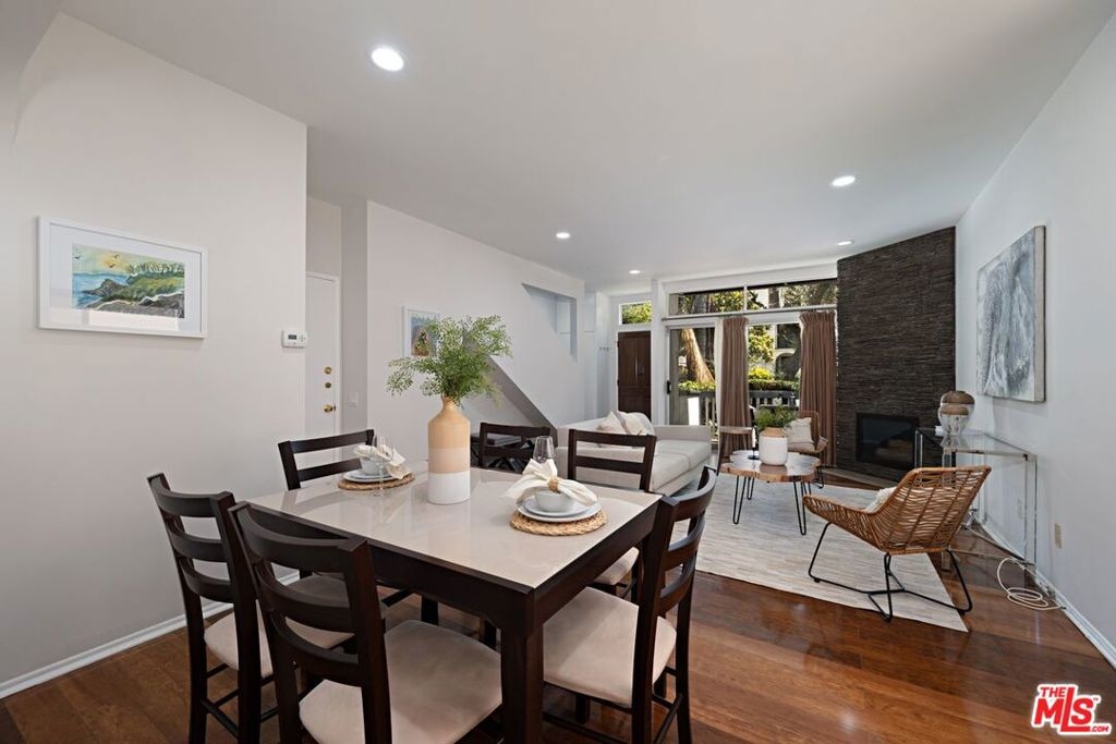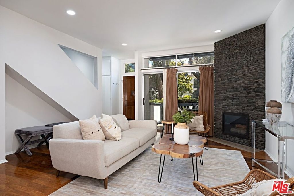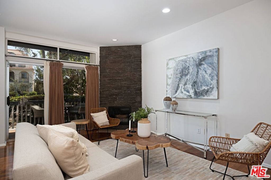 Santa Monica Townhouse -2bed/1.5bath blocks from beach! Sunny front unit. Bright open floor-plan w/stone fireplace, dining area & powder room. Updated kitchen features stone counters, stainless steel stove, double door refrigerator, built-in microwave, dishwasher & breakfast area. Private patio. Upper master featuring balcony, vaulted ceilings & skylight. Master bath features separate tub /shower and double sink. Secondary bedroom great for office /den or guest room with high ceilings and large closet. Stackable laundry closet on second floor. Direct access parking w/ 2 side-by-side assigned spots and storage. Small courtyard building blocks from Third Street Promenade, Santa Monica Pier, Beach, Montana Ave shopping & bike/running paths! Low HOA & pet friendly building.