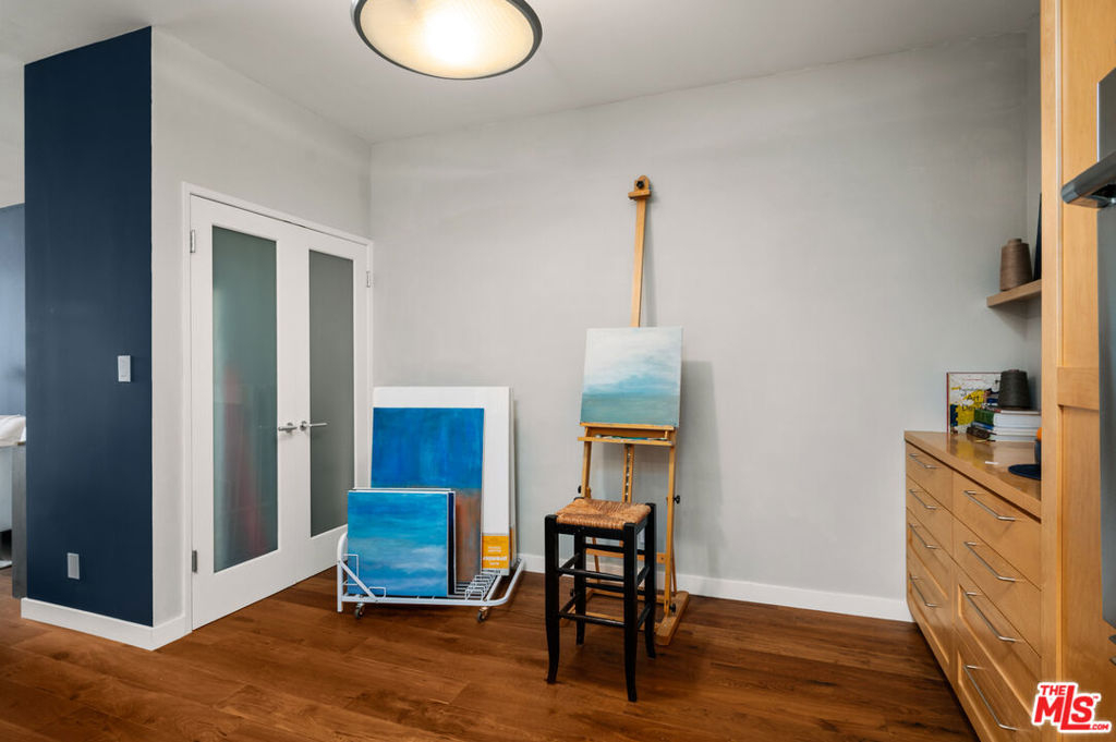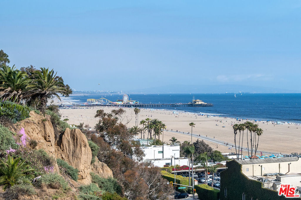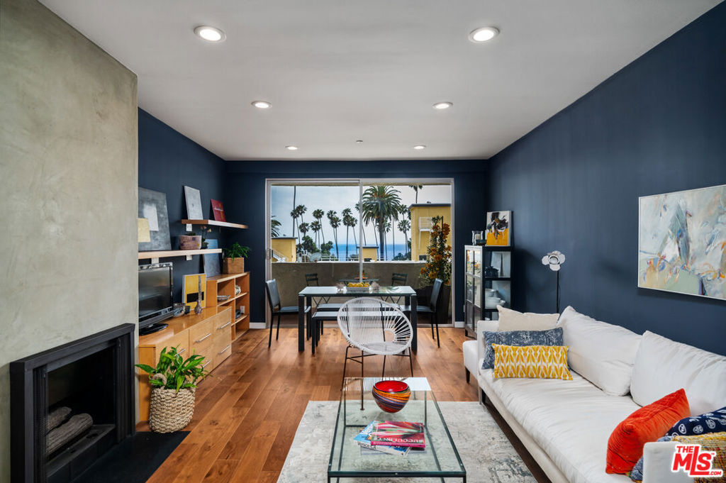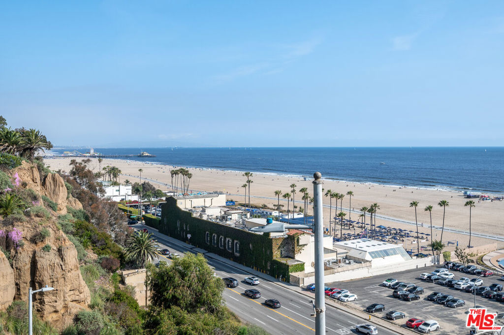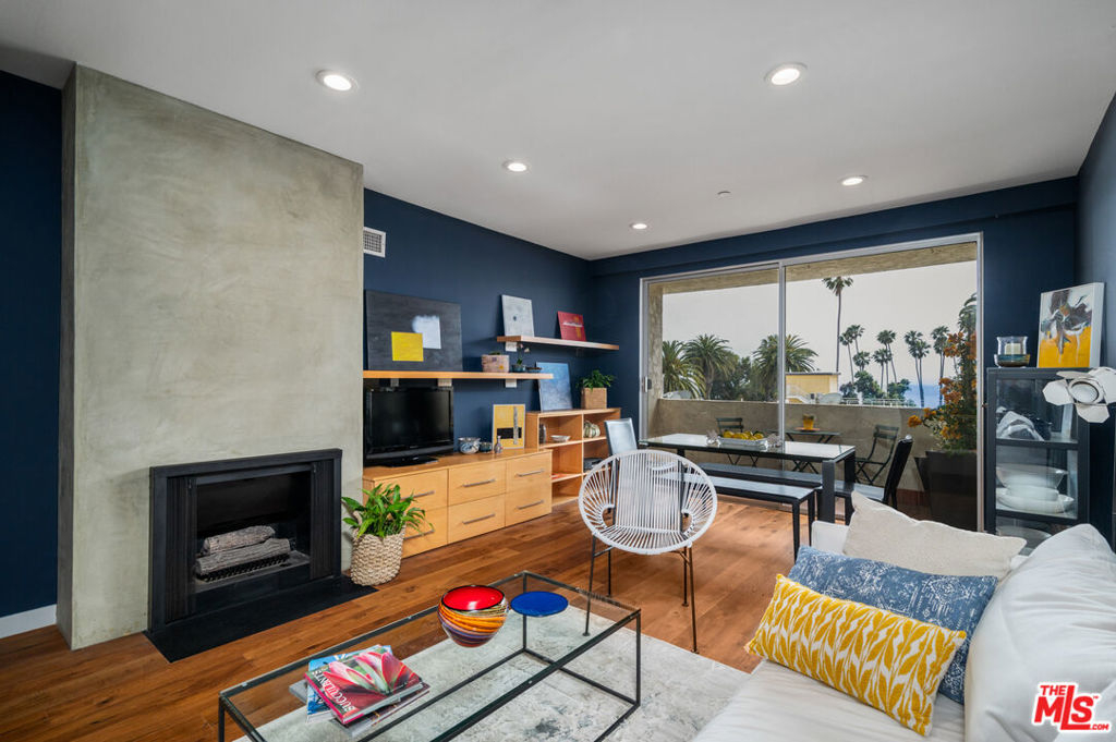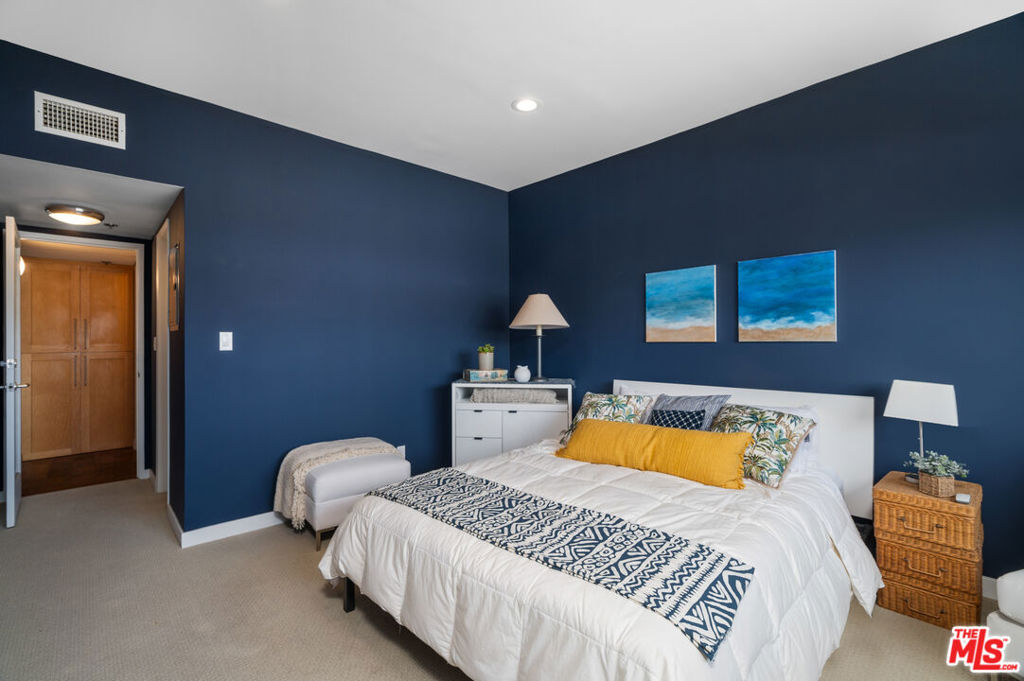 Incredibly rare, Modern Light Filled One Bedroom Penthouse with Ocean Views in North Santa Monica. Experience the beach life from this luxurious condo with ocean view! Interior designed by a celebrated multidisciplinary artist, this chic ocean view residence has it all. Navy blue walls serve as a bold backdrop that accentuates the expanse of the ocean, creating a dynamic interplay between the interior and the natural world outside. This deep hue adds a touch of drama and sophistication, while planes of lighter colors, such as the warm tones of cabinetry, soft light walls, and pristine white countertops provide a calming balance. The contrast is grounded by the rich texture of stunning wood floors, which harmonize the design elements and complete the elegant aesthetic of the space. Sleek built-in cabinetry throughout the living space provides exceptional storage while also weaving a visual thread of continuity, leading your gaze to the breathtaking ocean vistas. The entry has a cozy seating area for shoe removal, a full-length mirror, and a spacious walk-in closet to keep life's essentials organized yet out of sight. Culinary enthusiasts will revel in the cook's kitchen, boasting expansive Caesarstone countertops and premium appliances designed to make cooking and entertaining a seamless experience. The versatile floorplan adapts to your lifestyle, offering space for a home office or an artist's studio. In the bedroom, awaken to ocean waves or indulge in extra slumber with motorized shades. A larger walk-in closet with custom-built ins enhances this private retreat. The bathroom is a sanctuary of its own, featuring a walk-in shower, a sumptuous deep soaking tub, double vanities, and natural stone and quartz surfaces for a spa-like atmosphere. Enjoy the convenience of your own Miele washer and dryer. Frosted glass doors throughout the residence ensure privacy while maintaining an airy, light-filled ambiance. Begin your day with the ocean's breeze on your private balcony or unwind in the evening with a sunset ocean view, all from the comfort of your coastal retreat. Amenities include: secure access building, gym, and sauna. HOA dues include Earthquake Insurance. Easy to show - Don't miss this opportunity!