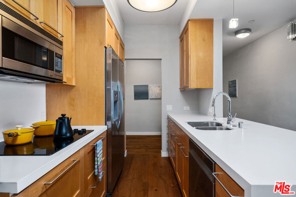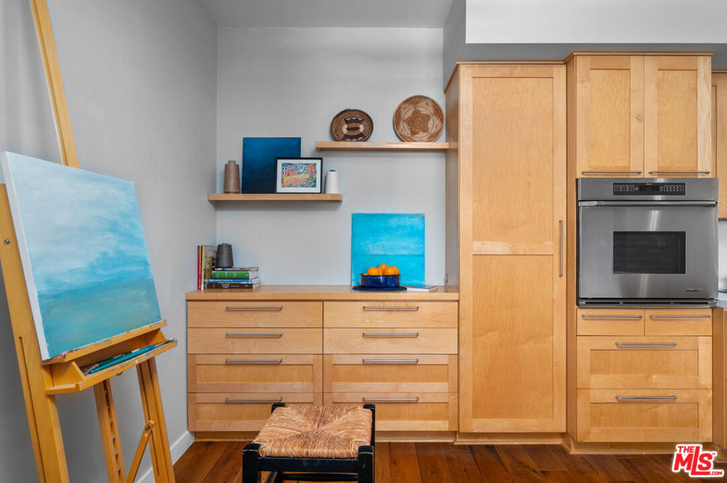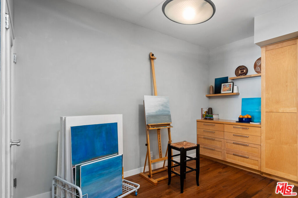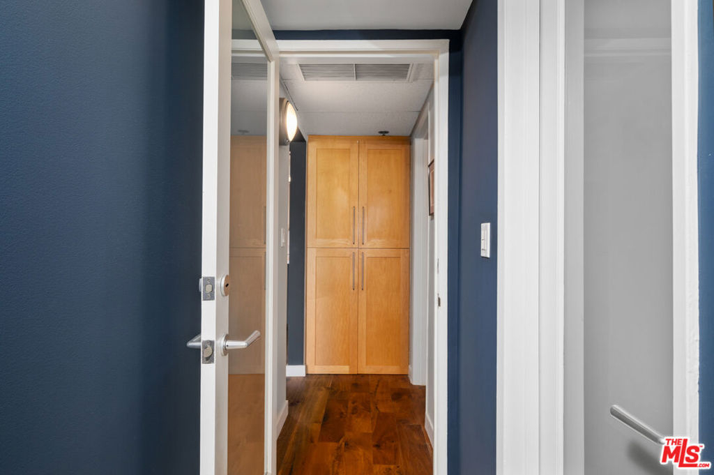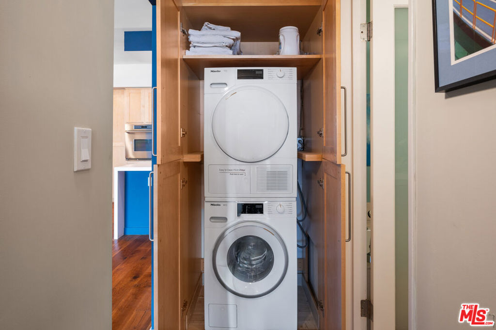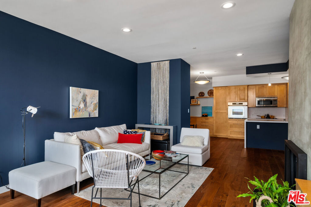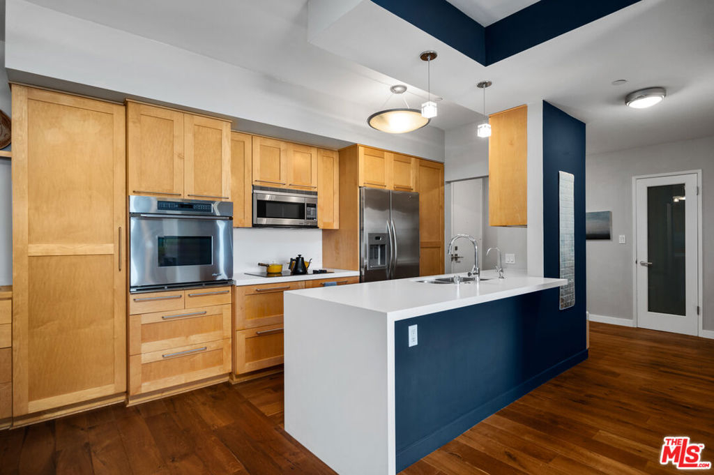 Incredibly rare, Modern Light Filled One Bedroom Penthouse with Ocean Views in North Santa Monica. Experience the beach life from this luxurious condo with ocean view! Interior designed by a celebrated multidisciplinary artist, this chic ocean view residence has it all. Navy blue walls serve as a bold backdrop that accentuates the expanse of the ocean, creating a dynamic interplay between the interior and the natural world outside. This deep hue adds a touch of drama and sophistication, while planes of lighter colors, such as the warm tones of cabinetry, soft light walls, and pristine white countertops provide a calming balance. The contrast is grounded by the rich texture of stunning wood floors, which harmonize the design elements and complete the elegant aesthetic of the space. Sleek built-in cabinetry throughout the living space provides exceptional storage while also weaving a visual thread of continuity, leading your gaze to the breathtaking ocean vistas. The entry has a cozy seating area for shoe removal, a full-length mirror, and a spacious walk-in closet to keep life's essentials organized yet out of sight. Culinary enthusiasts will revel in the cook's kitchen, boasting expansive Caesarstone countertops and premium appliances designed to make cooking and entertaining a seamless experience. The versatile floorplan adapts to your lifestyle, offering space for a home office or an artist's studio. In the bedroom, awaken to ocean waves or indulge in extra slumber with motorized shades. A larger walk-in closet with custom-built ins enhances this private retreat. The bathroom is a sanctuary of its own, featuring a walk-in shower, a sumptuous deep soaking tub, double vanities, and natural stone and quartz surfaces for a spa-like atmosphere. Enjoy the convenience of your own Miele washer and dryer. Frosted glass doors throughout the residence ensure privacy while maintaining an airy, light-filled ambiance. Begin your day with the ocean's breeze on your private balcony or unwind in the evening with a sunset ocean view, all from the comfort of your coastal retreat. Amenities include: secure access building, gym, and sauna. HOA dues include Earthquake Insurance. Easy to show - Don't miss this opportunity!
