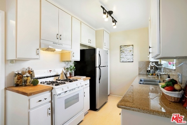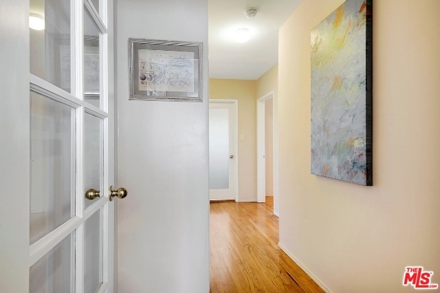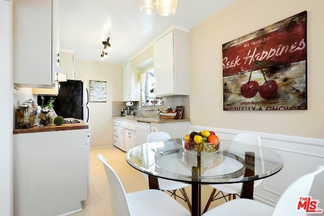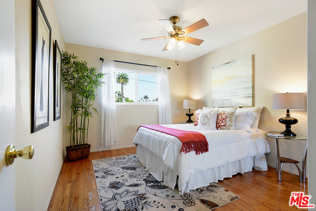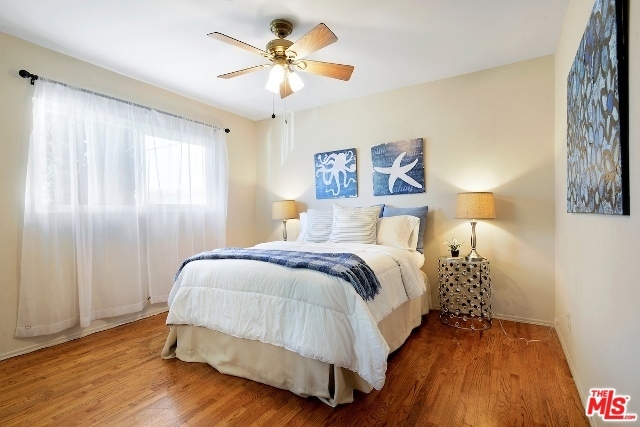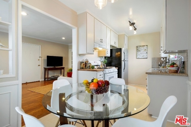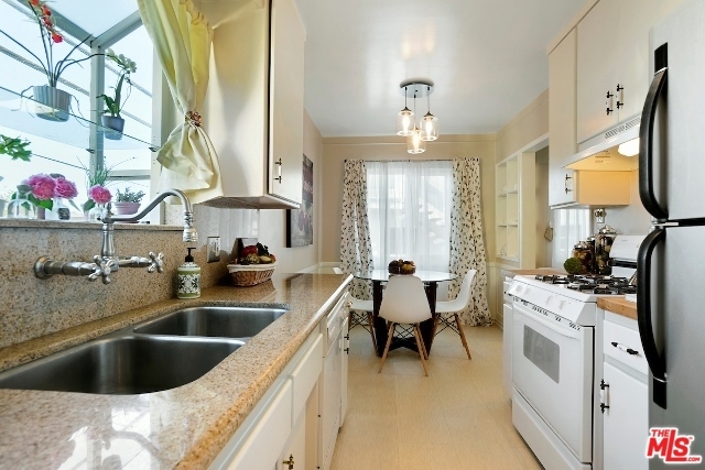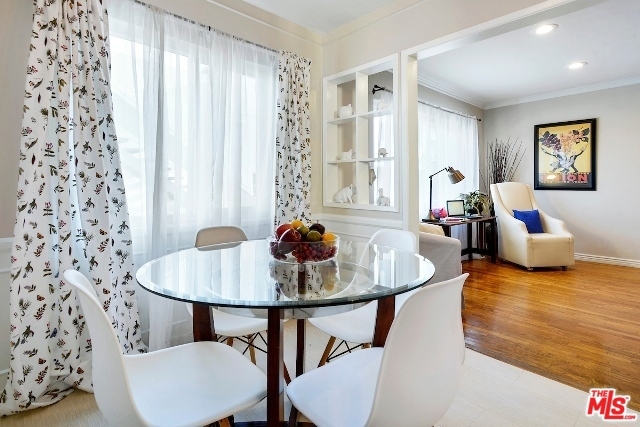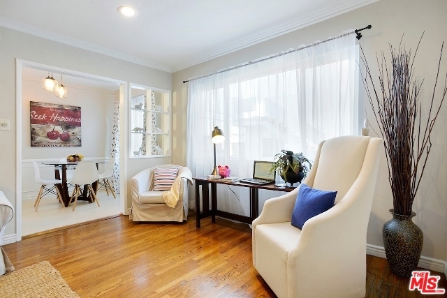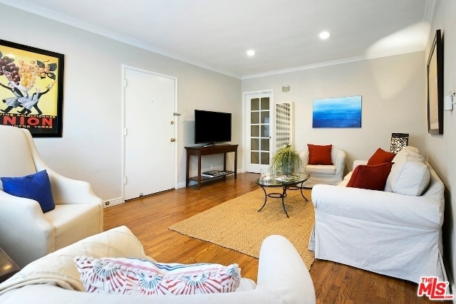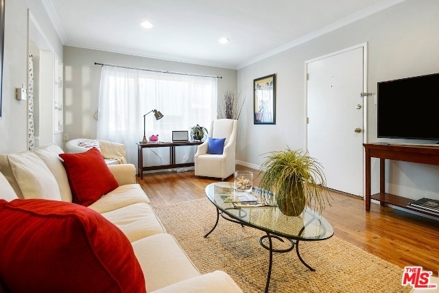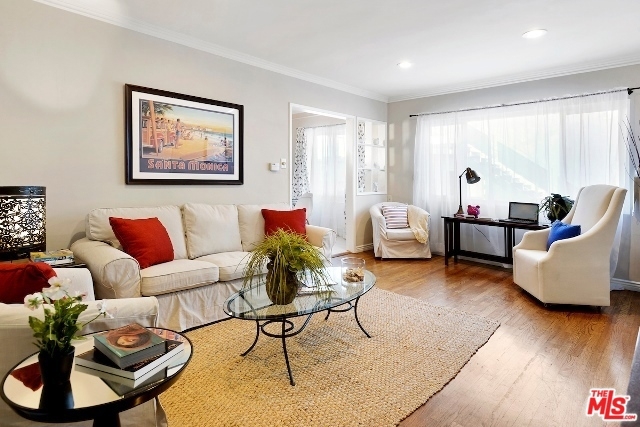 Absolutely Charming Santa Monica Condo! Beautifully light filled top floor unit with only one common wall set in a garden style condo complex.Hardwood floors and double pane windows throughout with crown moldings and recessed lights in living area. Spacious living room with enough room for an office. Kitchen with granite counter tops and greenhouse window. Lovely and sunny dining area, good amount of closet and storage , updated tiled bathroom with laundry, Ceiling fans in bedrooms, one car garage with lots of storage area. Minutes to the beach, dining, shops and Metro stop.