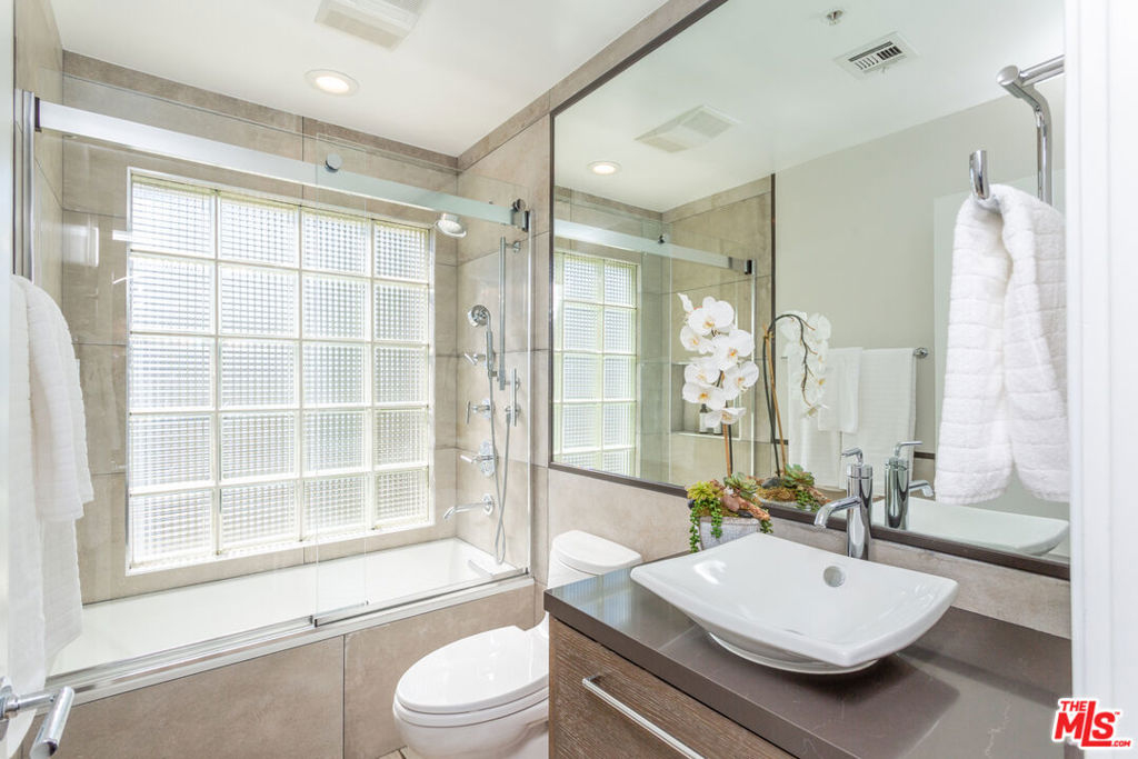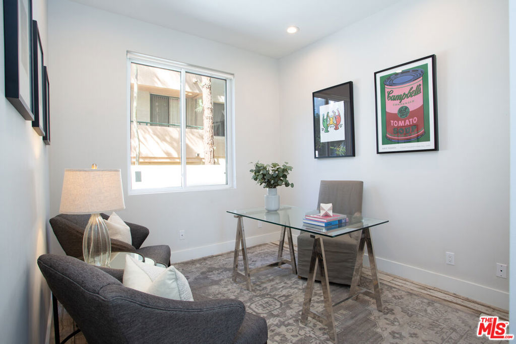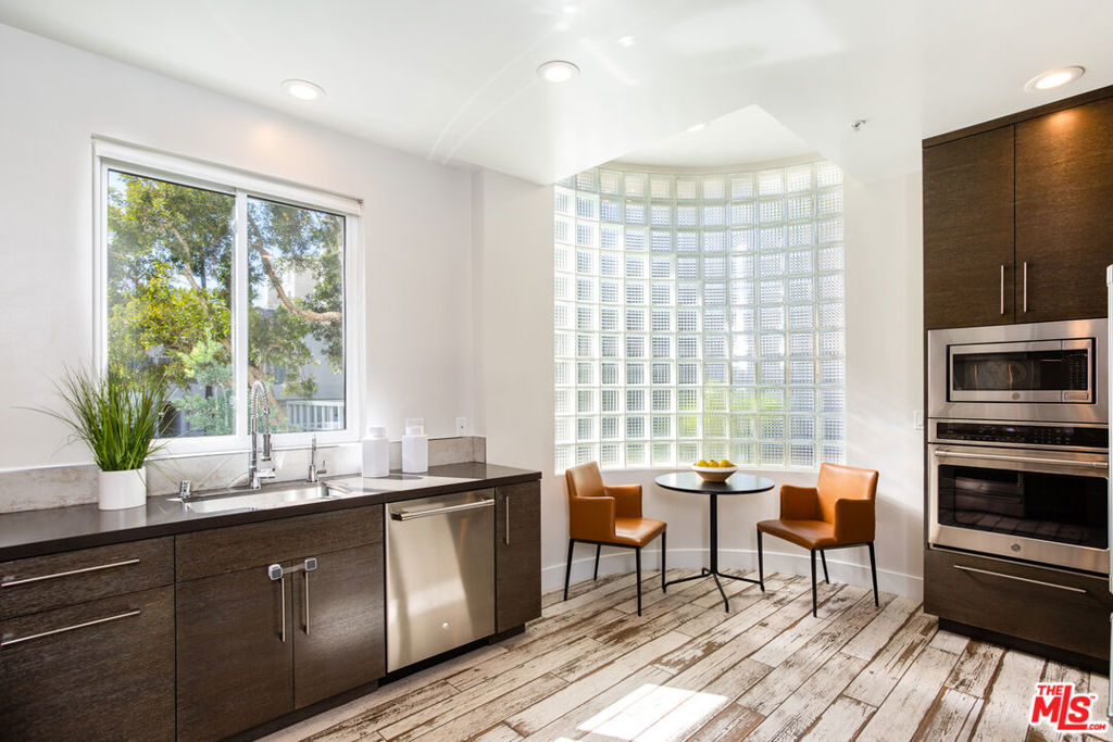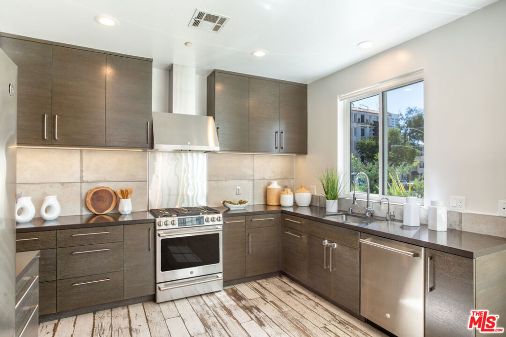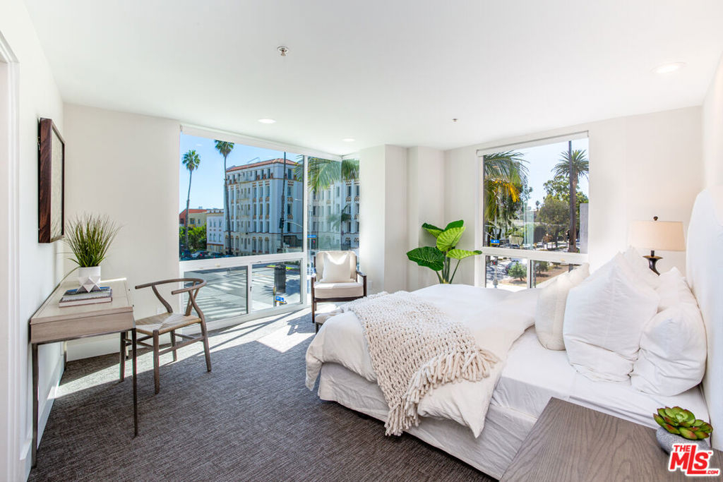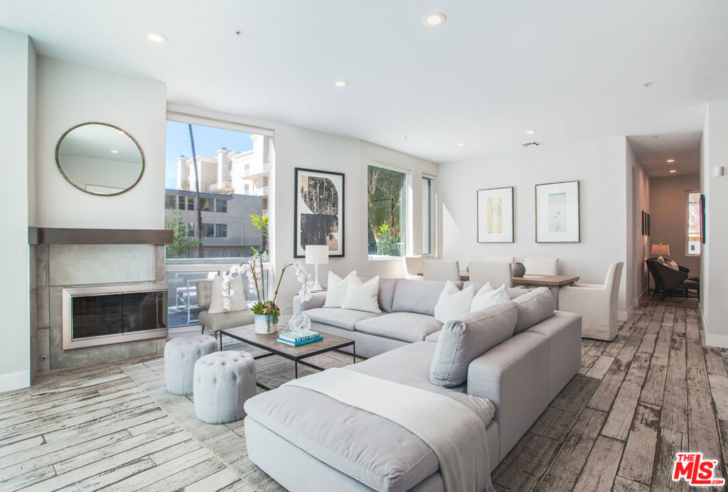 Exquisitely executed design and the finest materials create an elevated lifestyle in this dramatic 3BR + Den townhouse. The 12-foot ceilings and walls of glass and the massive wrap-around private patio impart light, volume, and space. Walker-Zanger porcelain farmhouse tile floors, an artful kitchen with cerused oak cabinets, quartz counters and high-end stainless steel appliances. A large den perfect for home office, gym or guests plus a 3/4 bath round out the first level. Upstairs, three spacious bedrooms including an impressive corner primary suite with city views and a luxurious bath with glassed shower stall and separate soaking tub. Over 2,000 SF. 2-car side-by-side parking in security garage, elevator building, additional secured storage, guest parking and Earthquake insurance. Exclusive Santa Monica location North of Wilshire and just steps to Ocean Ave, Santa Monica beach, Third Street Promenade, Palisades Park, Montana Ave and more. Absolutely beautiful!
