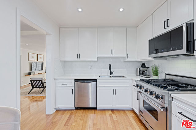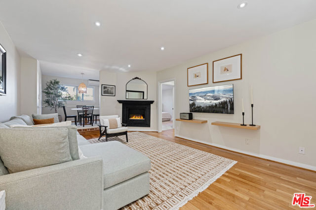 Discover this bright and inviting 1-bed, 1-bath condo featuring abundant natural light and an open, airy layout. The beautifully remodeled kitchen boasts shaker cabinets, quartz countertops, and stainless-steel appliances and seamlessly opens into the dining room. Relax in the spacious living room complete with a cozy gas fireplace, or step out onto your private balcony to enjoy fresh air and sunlight. The bedroom provides ample closet space with custom shelving. You will also find plenty of storage space in the hallway cabinets and the large closet in the living room. Located just half a block from Montana Avenue, you're moments from the area's most coveted shops, cafes and restaurants, creating an unmatched blend of convenience and lifestyle. Additional highlights include air conditioning, gated parking, a designated parking spot, and very low HOA dues.