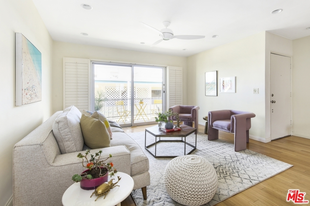 Just half a block from Montana Ave boutiques and eateries, this bright upper unit 2 BD + 2 BA has everything your heart desires: Wood floors, newer windows, custom shutters, a remodeled open kitchen and a Fleetwood slider to the balcony, and two spacious bedrooms. The building is gated, has a newer roof and EQ insurance. Other features include: inside laundry and 1 car parking with a huge storage locker. Come live the quintessential Santa Monica lifestyle, 10 blocks from the beach with a "Walker's Paradise" walkscore.com of 90/100!