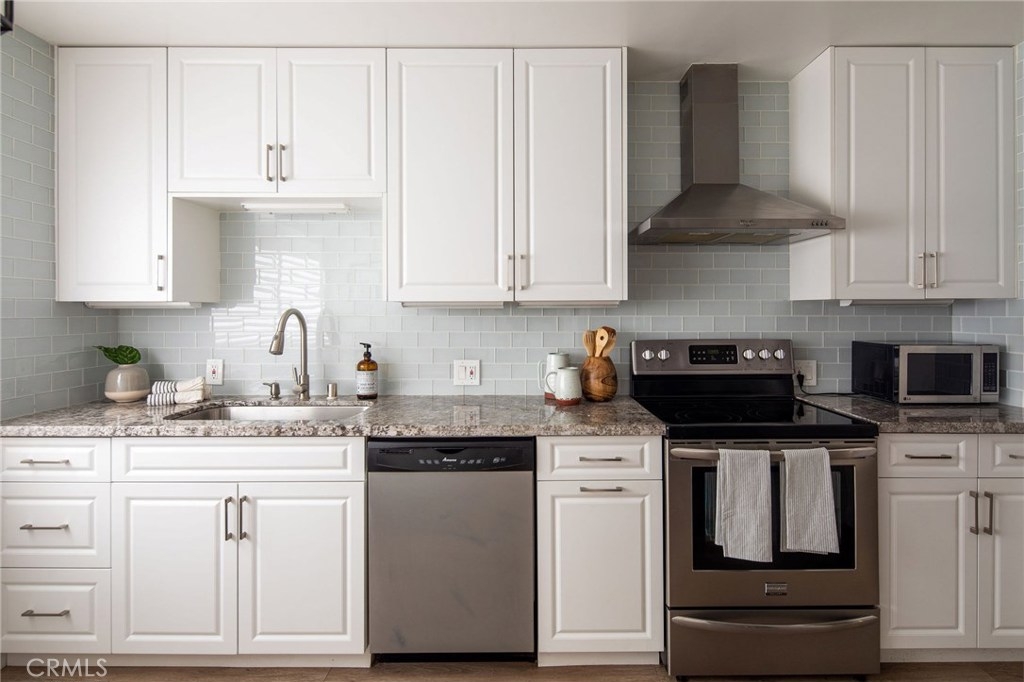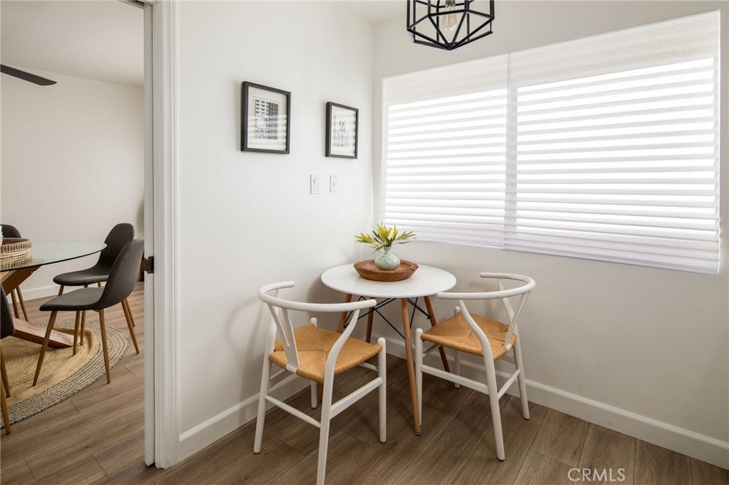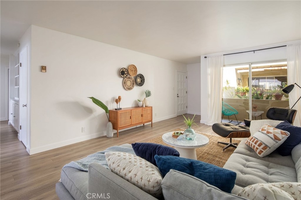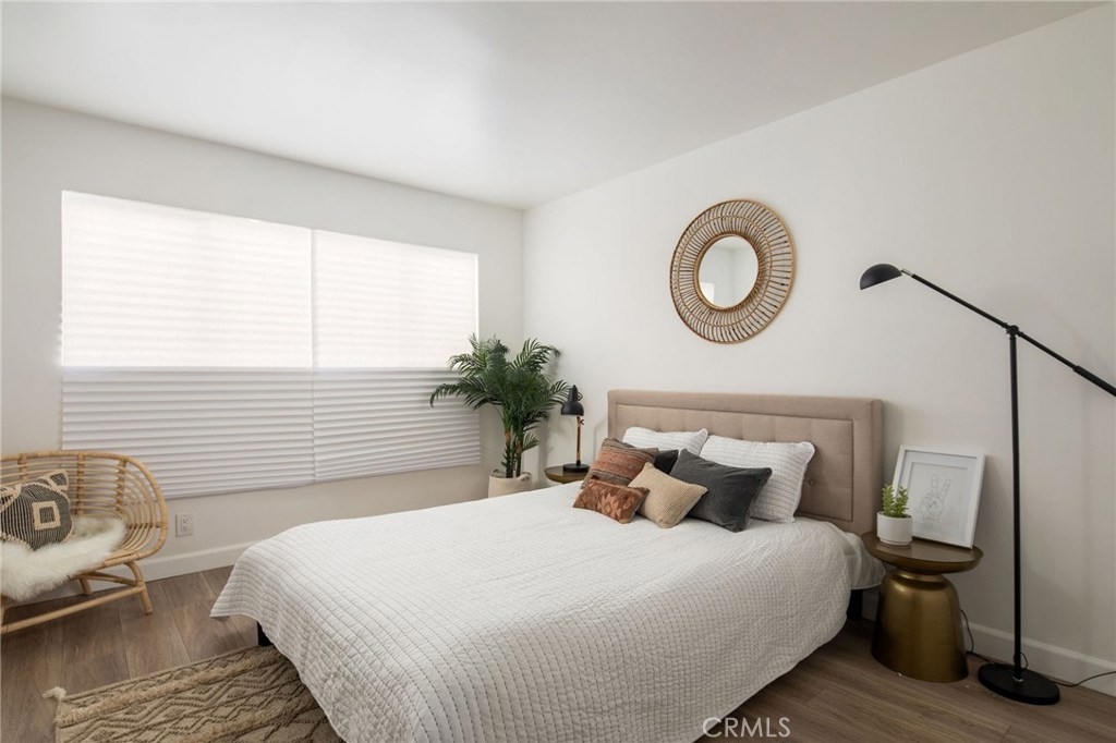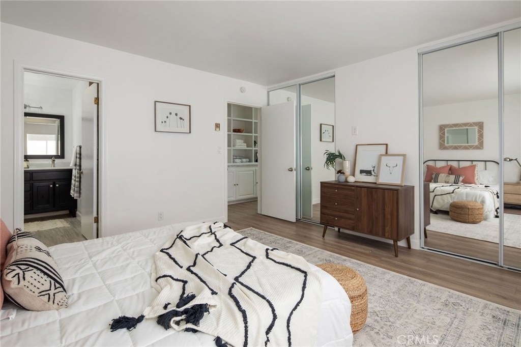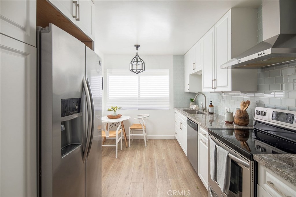 Tastefully remodeled, turn-key 2-bedroom/2-bath Santa Monica condo on a tree-lined street! Walking distance to Bristol Farms, Milo & Olive, Douglas Park, just a stone’s throw to trendy eateries and shops in Brentwood, and minutes from the beach - where the popular Santa Monica Pier and the classic California beach life await! The lovely courtyard takes you to this beautiful unit with plenty of storage space - do you dream of having a walk-in closet for your pantry? Engineered wood flooring throughout, a large living room with access to the patio where you can sip your coffee (or cocktail!) while you delight in the gentle ocean breeze. Bright separate dining room with a large window is perfect for fabulous entertaining. The remodeled kitchen with granite counter tops, subway glass tile backsplash, all stainless steel appliances and range hood is ready for the chef in you! The kitchen has a bright breakfast nook with a large window ready for your mornings to start happily. The hallway has a beautiful built-in cabinet with a marble top and recessed lights. The two Master Suites have abundant closet space; one with a walk-in closet - both have chic bathroom vanities with quartz countertops. A European washer and dryer combo is inside a closet in the unit in addition to the community laundry room! Easy access to one-car parking space is in the detached alley garage. Take a stroll in this highly-desirable neighborhood with a walk score of 92 - a walker's paradise! Welcome home.