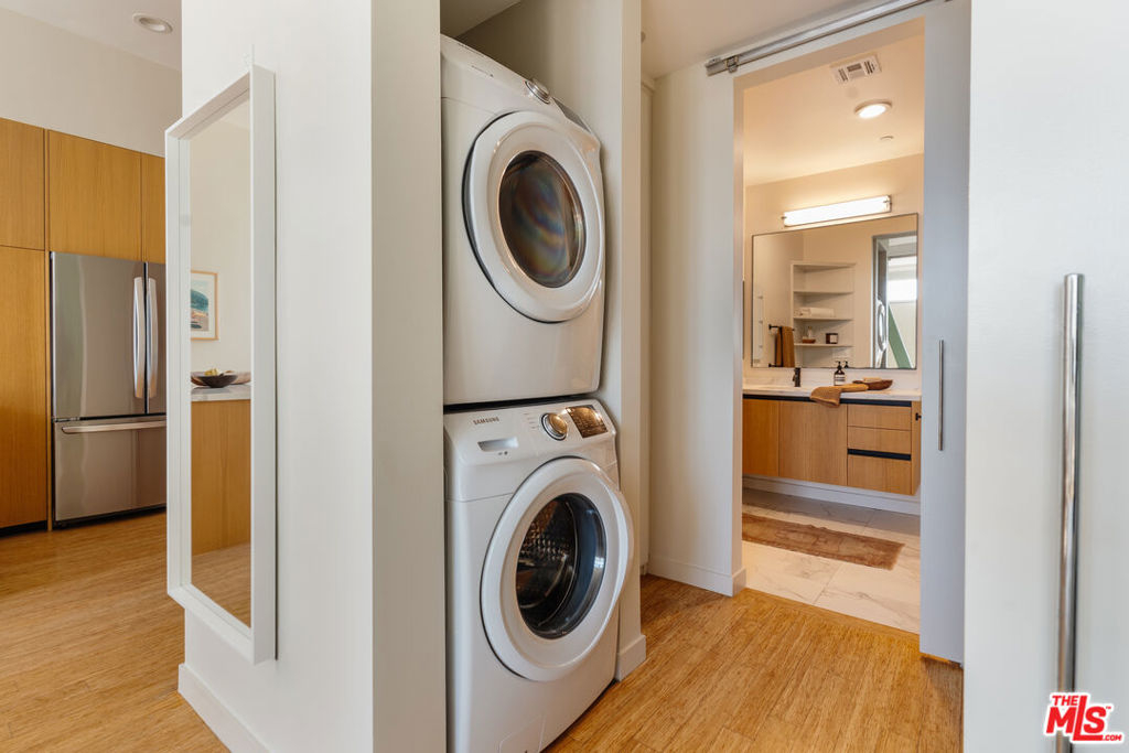Situated on the quiet, south-facing side of the Broadway Lofts, this second-floor studio offers a distinct blend of modern style and comfort. Unlike many other units in the building, this residence has been remodeled to create a warmer, cozier atmosphere while still maintaining its open loft appeal. 10-foot floor-to-ceiling windows line the south-facing walls, filling the space with natural light throughout the day. A standout feature is the oversized balcony, which provides a spacious outdoor area ideal for working from home or relaxing in the sun. The condo includes in-unit laundry, central air conditioning, and the rare benefit of secure, side-by-side parking for two vehicles, along with ample storage space and six guest parking spaces. Fresh air and sunlight flow throughout the common areas thanks to the open, architectural design. Building security is a priority, with key fob access required for common areas, elevators, and the garage. Residents also have access to a shared rooftop deck with city views. Conveniently located just blocks from Whole Foods, Trader Joe's, Co-Op Market, Ralph's, Tartine, Santa Monica Brew Works, Water Garden complex, parks, gyms, Expo-line, and only minutes from the 10 Freeway. A huge plus for cyclists is that Broadway has dedicated bike lanes to the Promenade and the Pier, ideal for enjoying beach living while leaving the car at home. HOA fees include earthquake insurance.