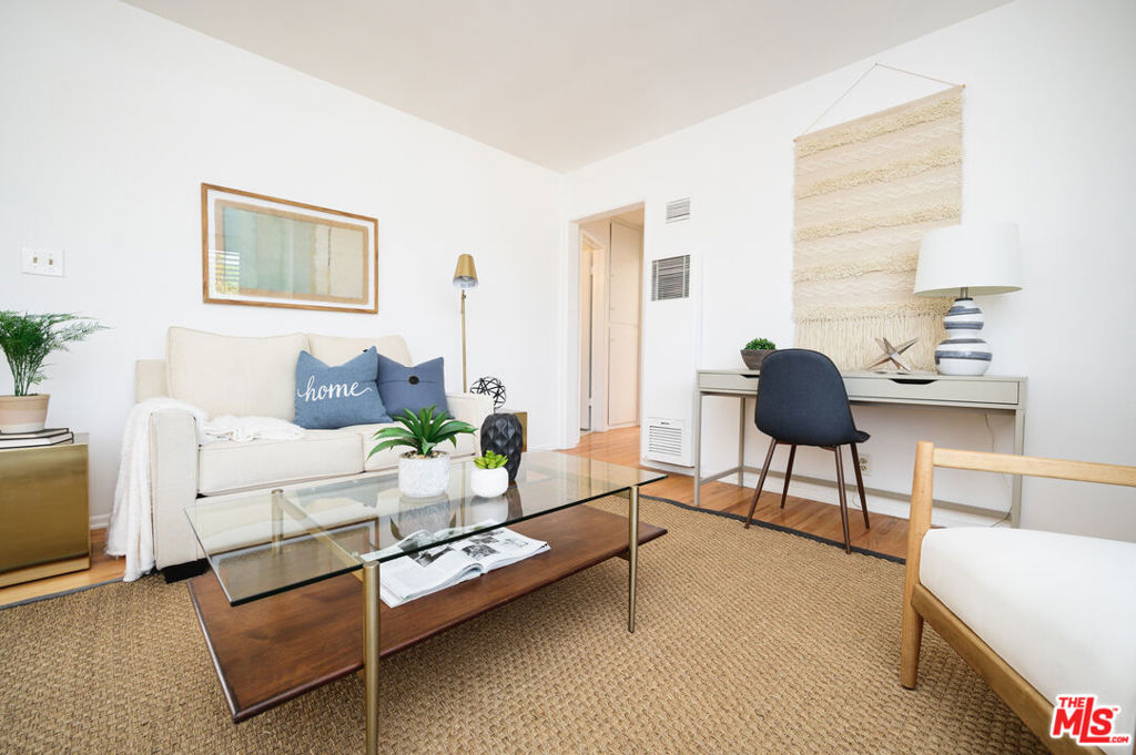 This is what you've been waiting for! Light and bright updated 2bed + 1bath condo in charming, garden style mid-century complex. Spacious 2nd floor unit has only 1 shared wall and is located at the back of the complex. Sun lit living area has hardwood floors, large picture windows with shutters, and mini split AC. Dining area opens to west facing balcony, bringing in tons of natural light. Kitchen features stainless steel appliances, plenty of cabinet space, and a pantry. Updated bathroom with subway tile, new vanity and fixtures. Both bedrooms have large cedar closets, hardwood floors, and mini split AC. Community laundry onsite, 1 car garage parking & EQ insurance. Close to the Metro, Trader Joes, Bristol Farms, Literati Cafe, Bergamont and Amandine.