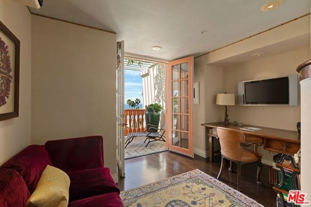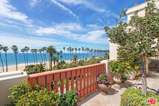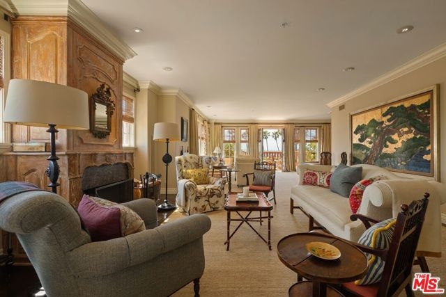 Originally built in 1928 and meticulously reconstructed in 1996, the historic El Tovar By The Sea seamlessly blends three distinct architectural periods: Classical Revival, Streamline Moderne, and Modified Classical Mediterranean. Nestled on the upper central end of Ocean Avenue, this full-service luxury building remains one of the most coveted addresses, and its 22 residences are among the most exclusive. Sitting above them all is the coveted jewel of the property - Penthouse South. Upon entering the exquisitely appointed foyer, the elevator will take you directly to a silk wallpaper-lined vestibule where your front door awaits. Step inside to be greeted by breathtaking ocean vistas and a sun-drenched living room bathed in southern light. French doors open onto a sweeping wrap-around balcony to take in the ocean air and watch the palm trees sway in serene privacy.The high ceilings and designer details complement this striking space that is as suitable for entertaining as it is for a quiet night at home by the wood burning fire. The formal dining room boasts Zuber hand-painted wallpaper, gold leaf ceiling, and views of the coast through the kumquat trees on the patio. The spacious kitchen with a generous island features top-of-the-line appliances, a separate butlers pantry providing ample storage, and a large adjacent laundry room. An elegant powder room with an antique vanity completes the first floor. Venture upstairs to discover the secluded sleeping quarters. The en-suite guest room features stunning views of the snow-capped mountains and two large closets. Down the hall, the spectacular primary suite beckons - here, you will feel transported as you look out from Palos Verdes to Point Dume and hear the gentle roar of waves as the sound cascades from the ocean. Step out onto the large balcony with separate sitting areas for sunny afternoon reading. Drift back inside and envision yourself immersed in another world as you enjoy the bedroom's fireplace before turning in for the night. The spa-like primary bath features Venetian plaster walls, soaking tub, and steam shower. A separate office space with views and balcony provides the ideal setting for your virtual work or a private space for study. Solid oak hardwood floors throughout underscore the grandeur of every detail. The home includes private 3 plus car garage with custom built-in storage cabinets. The building's state-of-the-art fitness center, pool, spa, and lush landscaping rival those of 5 star hotels. Situated along the bluffs of Palisades Park and just a short stroll from shops and restaurants - this is California living at it's finest and steeped in the history of iconic Ocean Avenue. When you are here, you are truly home