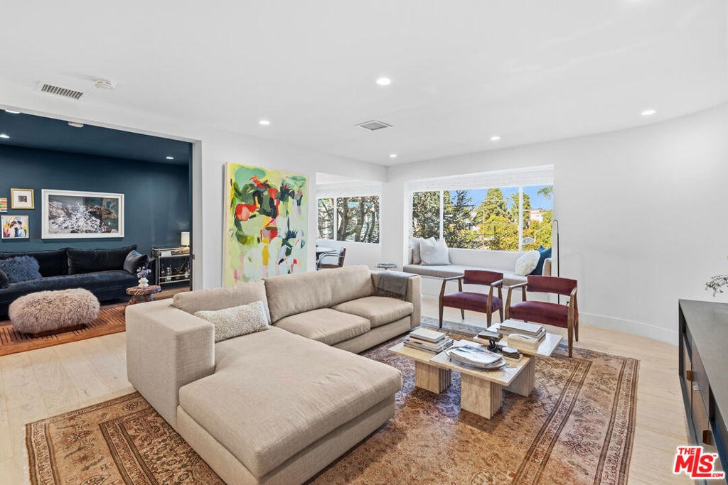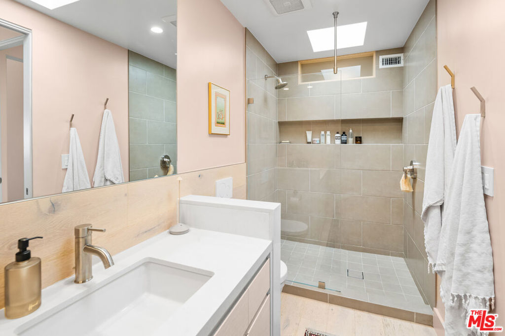 A rare, light-filled top-floor corner penthouse that lives like a London flat -- elevated, intimate, and quietly luxurious in Santa Monica's coveted Wilshire/Montana neighborhood. With multiple exposures and panoramic views of the Santa Monica Mountains, treetops, and cityscape, the home feels serene and cinematic from the moment you enter. Meticulously reimagined in a no-expense-spared renovation completed December 2021, this 3-bedroom, 3-bath residence offers approximately 1,612 sq. ft. of refined, design-forward living warm, modern, and timeless. The layout is open yet composed, created to let the light travel and the views take center stage. The living room is wrapped in new double-paned windows, framing the scenery like artwork, and anchored by a custom bay window with built-in bench seating -- an effortlessly chic spot for morning coffee, sunset light, or quiet conversation. Just beyond, the sunroom extends the living experience with an airy indoor-outdoor feel, ideal for reading, working, or entertaining while staying connected to the sky and treetops. The kitchen is tailored and architectural, thoughtfully reconfigured with Caesarstone countertops, custom whitewashed Spanish-oak cabinetry, and sleek integrated KitchenAid appliances concealed behind custom paneling for a clean, streamlined finish. An oversized dining island anchors the space for easy hosting and everyday gathering, while a mountain-view kitchen window adds a subtle daily delight. A versatile flex room with closet and private entry adapts beautifully as a third bedroom, den, office, fitness studio, or guest retreat is a rare optionality in a residence this polished. The primary suite is a true sanctuary of scale, featuring dramatic 20-foot ceilings, an oversized walk-in closet (including the original hidden floor safe), and a spa-like en-suite bath with Italian tile, dual vanities, a generous walk-in shower, and natural light streaming through original skylights. The second bedroom offers the same sense of volume with lofty ceilings, an en-suite bath, and a hidden, fully insulated storage loft with reinforced flooring. A third bath is elegantly executed as a refined wet room, with seamless waterproof cement walls that blend form and function.