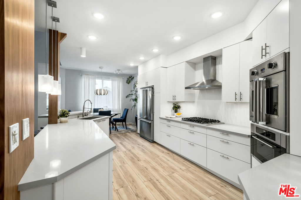 Ultra High-End Townhouse-Style 3 bed/2.5 bath Designer Remodeled Penthouse + an extra large private roof deck w/ sweeping city views in an A+ Santa Monica Location. Architecturally stunning living & dining spaces feature wide open indoor/outdoor living w/ high ceilings, luxury plank flooring, walnut clad walls, intimate fireplace, and a Luxe Chef's Kitchen w/ breakfast bar featuring all Viking Appliances, Quartz Countertops, Custom Cabinetry & much more. The great sized Master Bdrm Suite has an oversized walk-in closet & an en-suite master bath w/ tumbled travertine floors, his/hers floating vanities, modern tile throughout & a frameless shower w/ luxurious tub. The spacious 2nd bdrm features high ceilings w/ crown moulding & a newly renovated bath. The 3rd bedroom/office is an open loft that adjoins the spectacular private roofdeck. Building features in-unit washer dryer, resort style pool/spa, e-quake insurance, private storage room, gated side-by-side parking, elevator, & much more!