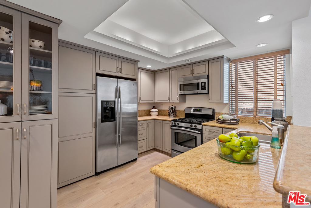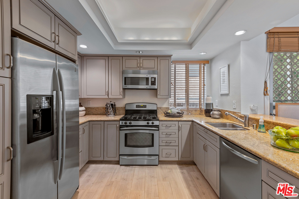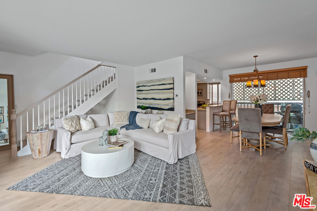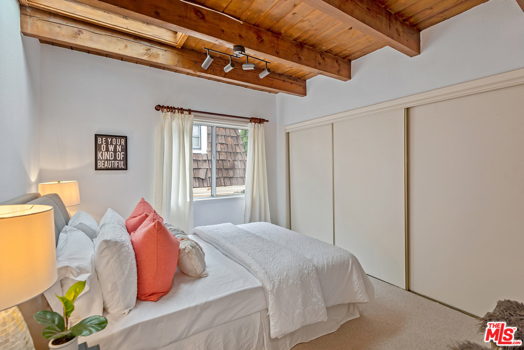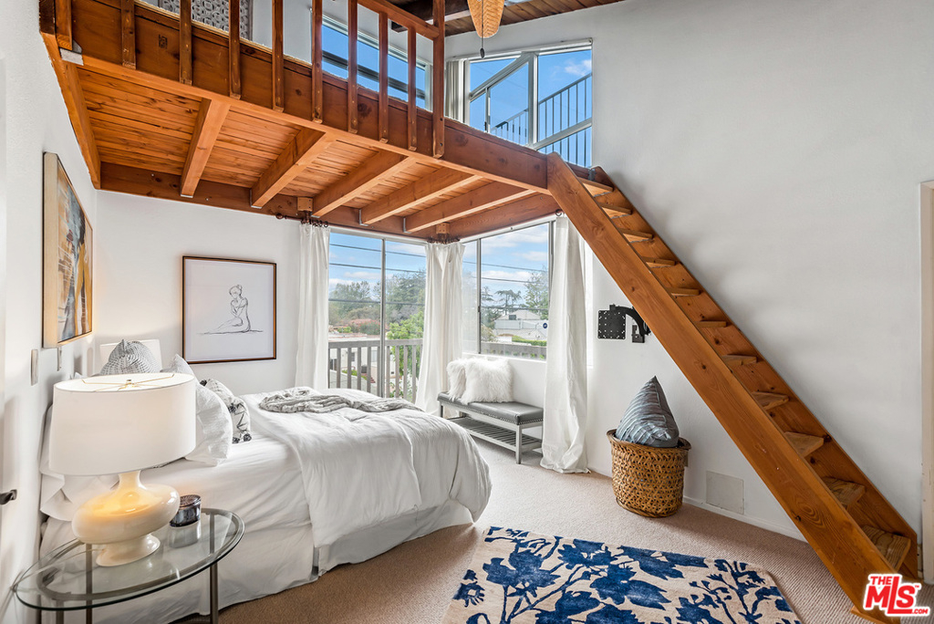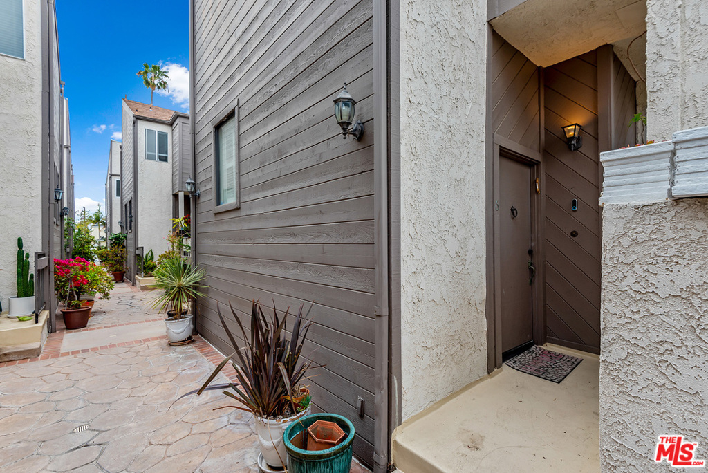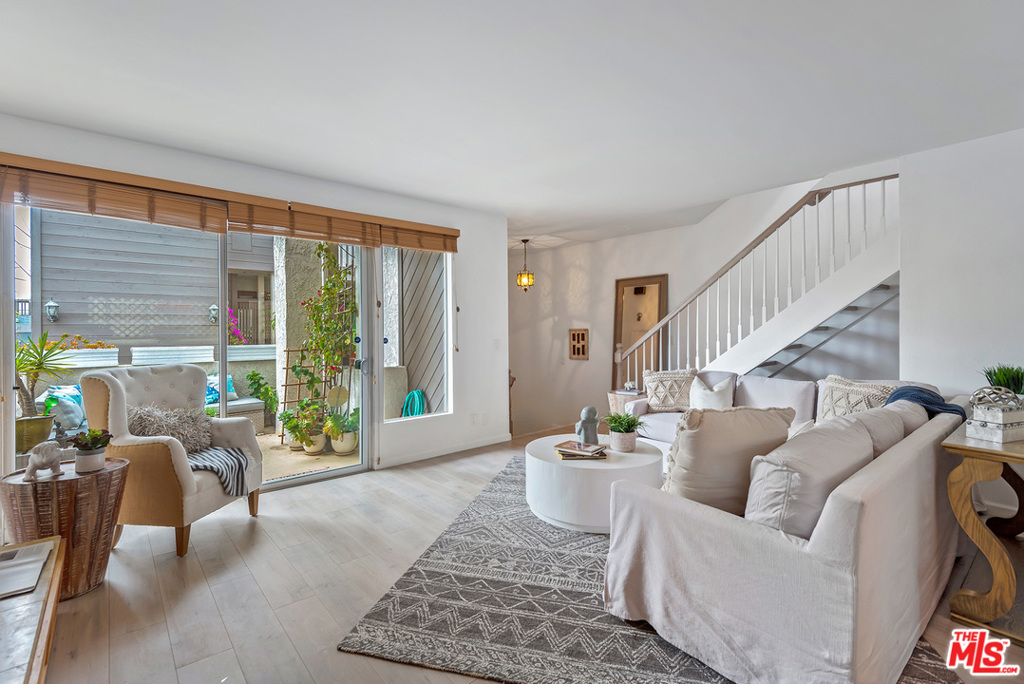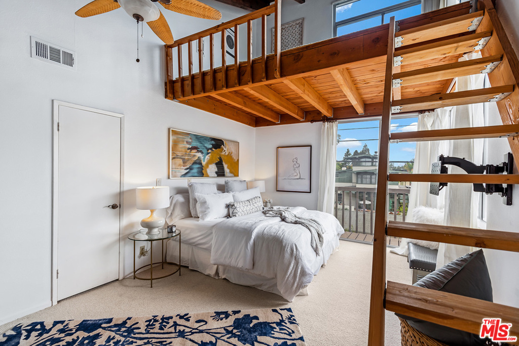 Beautiful sanctuary in the best Santa Monica location! This private rear unit has it all. Light and bright living room with fireplace, wet bar and wide plank flooring flows seamlessly out to a large patio for taking in the sun. Spacious dining area features its own balcony perfect for grilling al fresco. Open concept square kitchen with granite countertops, stainless steel appliances and lots of cabinets integrates perfectly with the dining area. Upstairs there are 3 bedrooms all with vaulted wood beam ceilings. The primary suite has a charming wooden loft that can be used as a reading area, office or yoga studio. It also boasts a walk in closet and regular closet, corner views, a small balcony and a spacious elegant bath with dual vanity. This property comes complete with an attached two car garage with storage and full laundry. All on a gorgeous walk street just minutes to the beach, shopping, restaurants and schools.