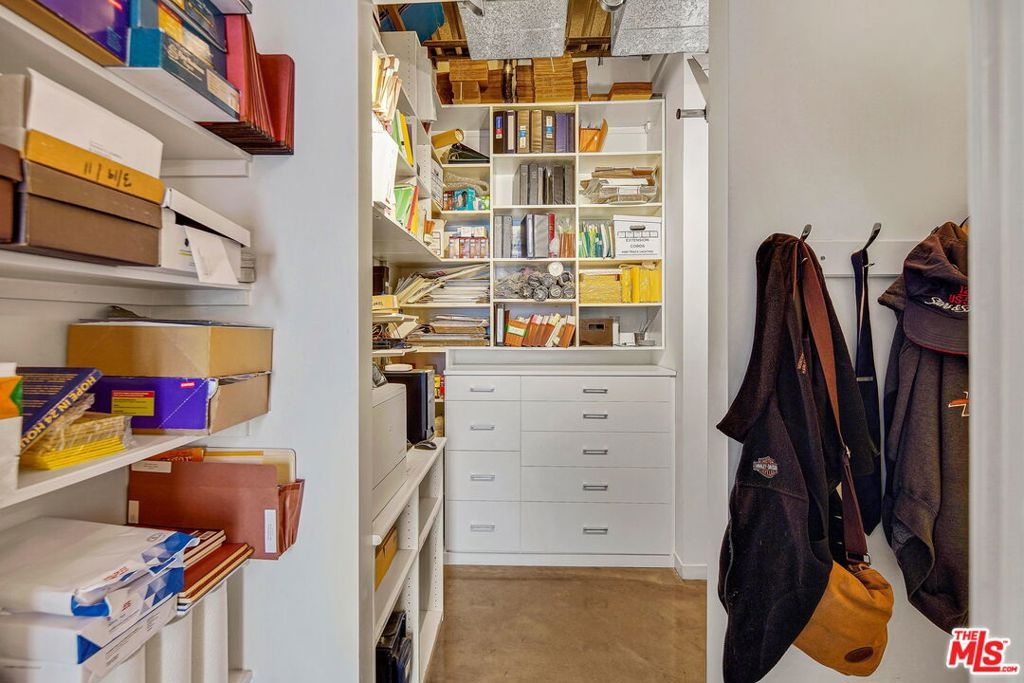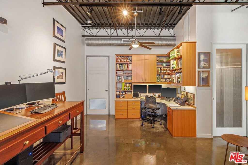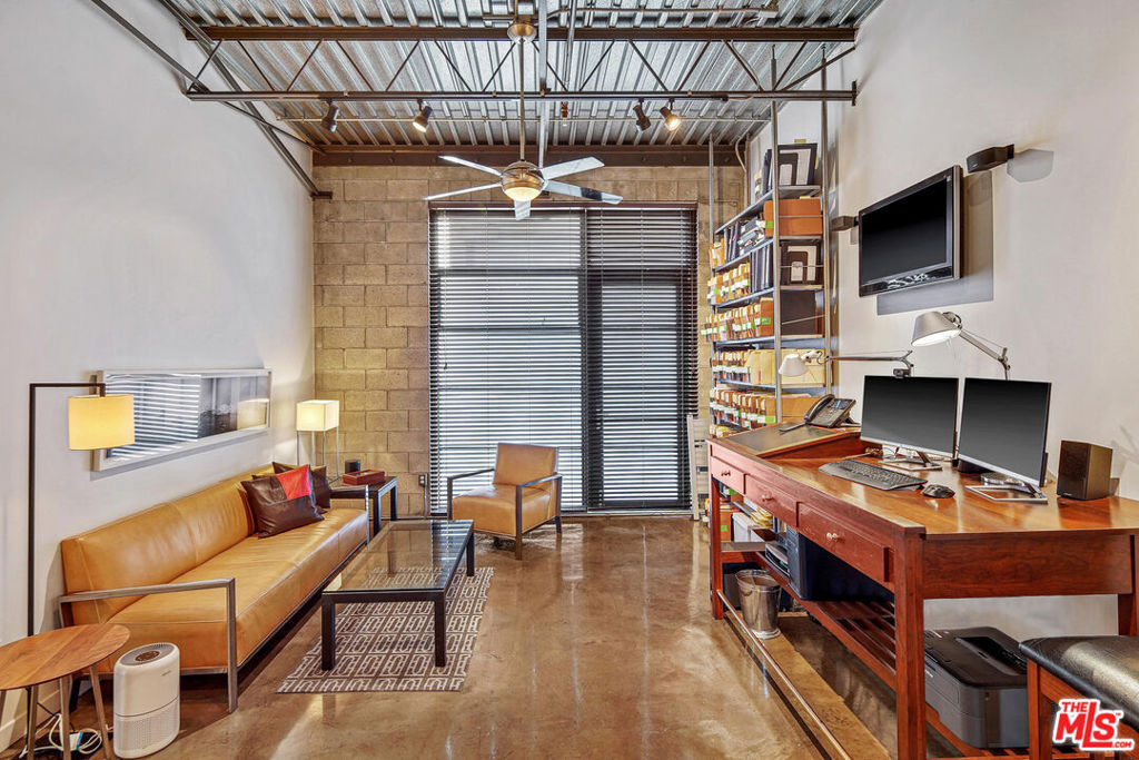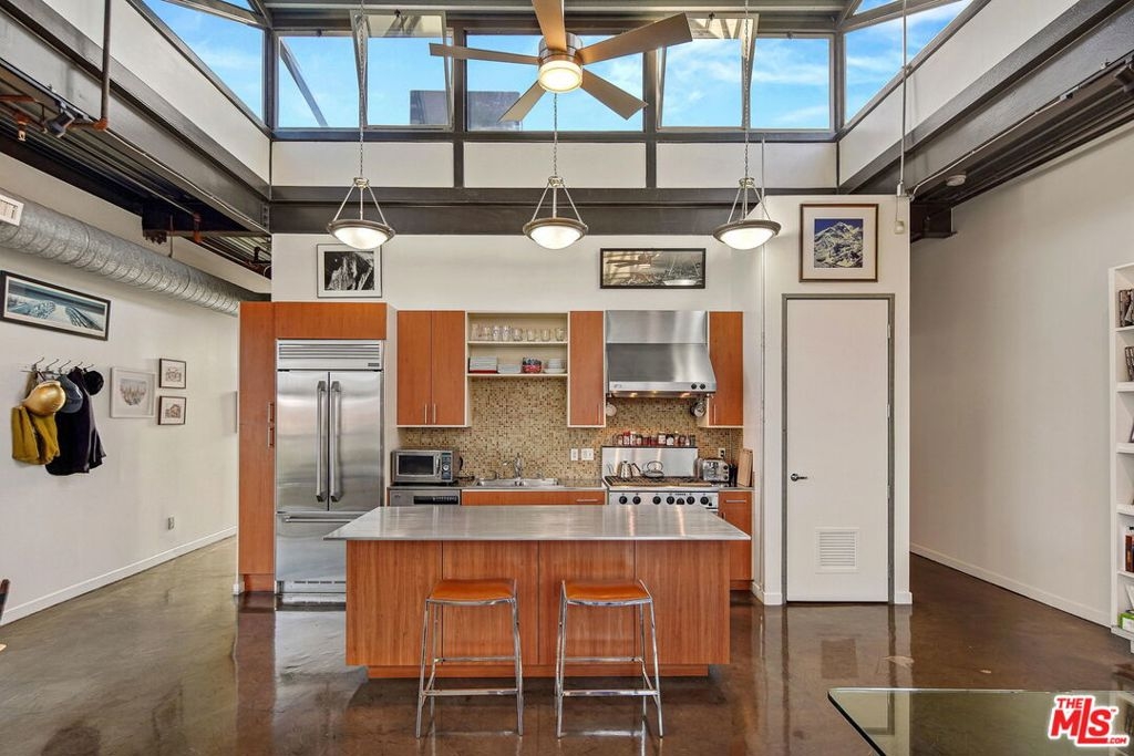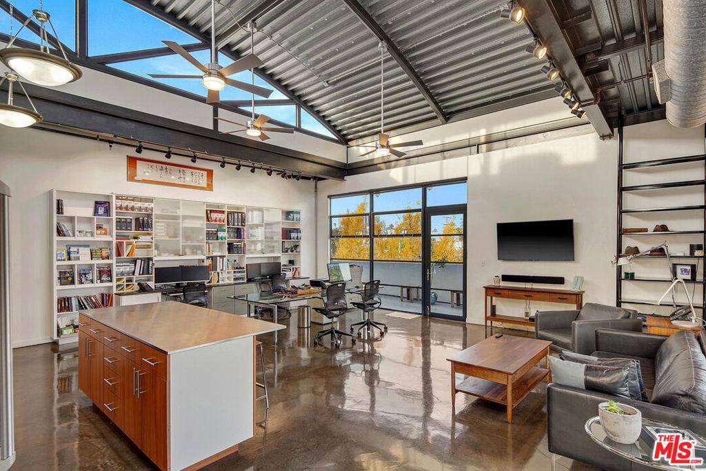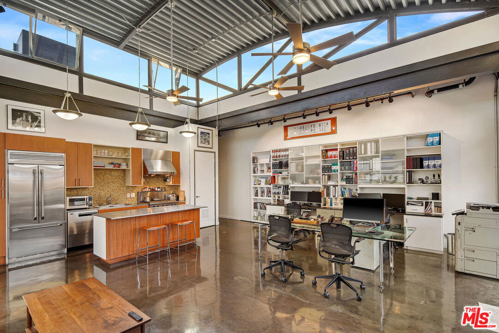 Just minutes from the beach in Santa Monica's Mid-City, this Pugh + Scarpa designed Live/Work loft offers industrial design features and an open floor plan infused with natural light. Enter to a sense of volume and hip contemporary style with polished concrete floors, large architectural windows and a coved metal ceiling with exposed beams and incredible height. Designed for both comfort and productivity, the main space features a living area and home office/studio with built-in shelving, along with access to a spacious balcony with plenty of room for outdoor entertaining. The eat-in kitchen is well equipped with modern stainless steel appliances and countertops, custom designer cabinetry and a large center island. The primary suite offers abundant closet space and a generously sized ensuite bath with double-vanity and oversized step-in shower. A guest bathroom with soaking tub and in-suite laundry complete this sleek and sophisticated unit. Zoned for Live/Work, the loft provides a mul