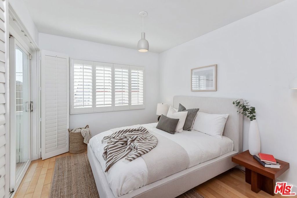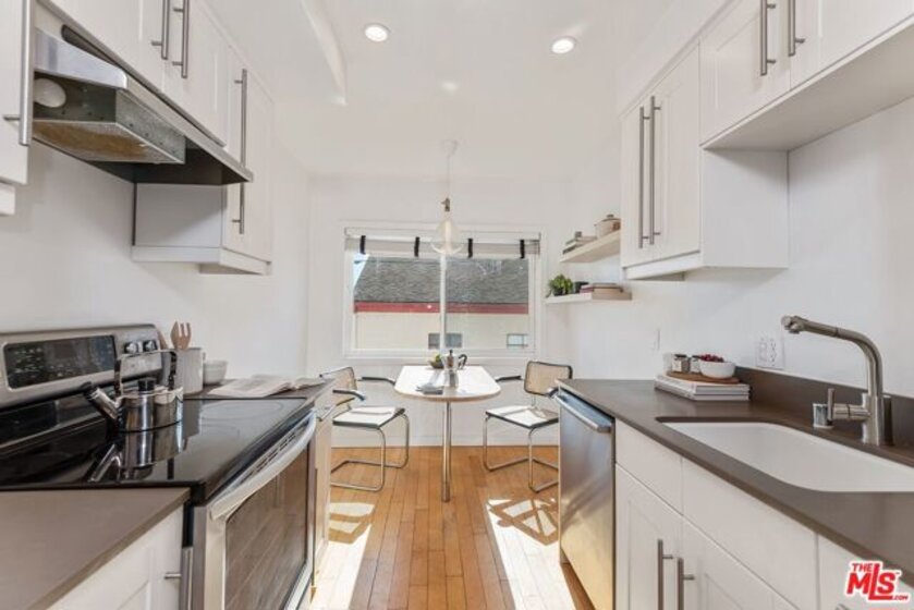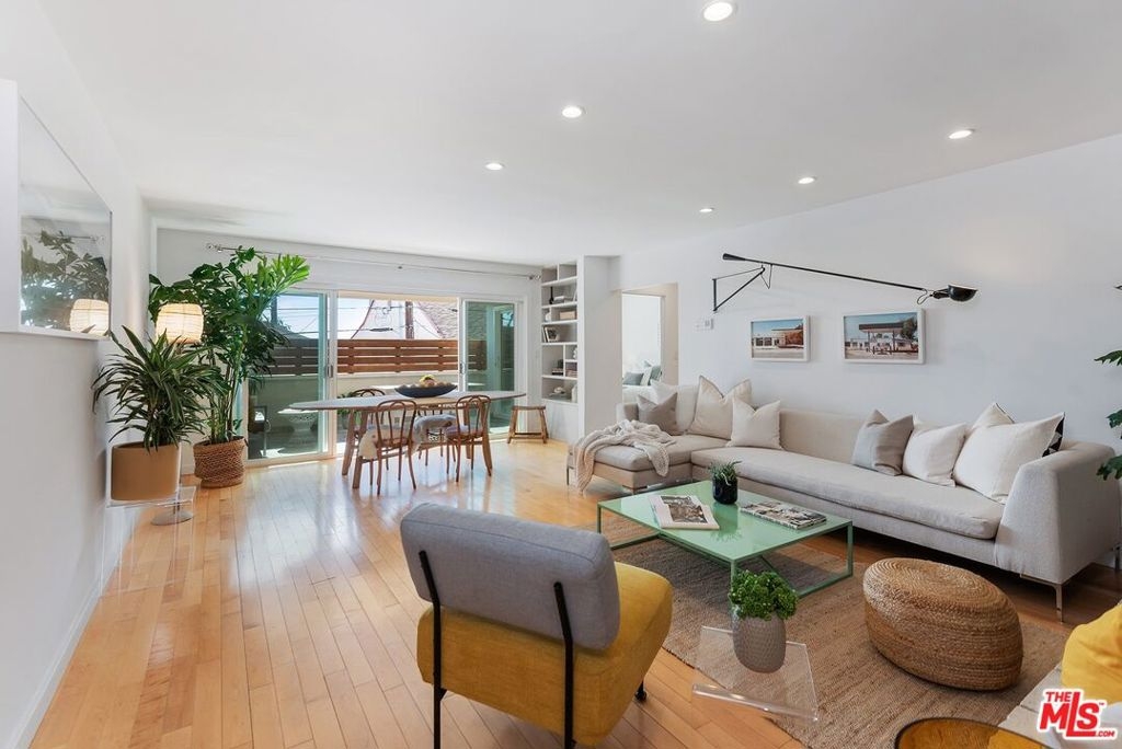 Enchanting courtyard building in prime North of Wilshire location with lush landscaping and koi pond. Light and bright, top-floor West facing unit. Large living and dining area with hardwood floors, recessed lighting, built-ins and fireplace that leads out to an oversized balcony perfect for entertaining. Expansive walls great for art. Eat-in kitchen with stainless steel appliances and updated cabinets and countertops. Master bedroom features multiple closets and an en-suite bathroom. 2nd bedroom could also function as a den or office. Dual pane windows and sliding doors. Franklin Elementary. Would make a wonderful place to call home!