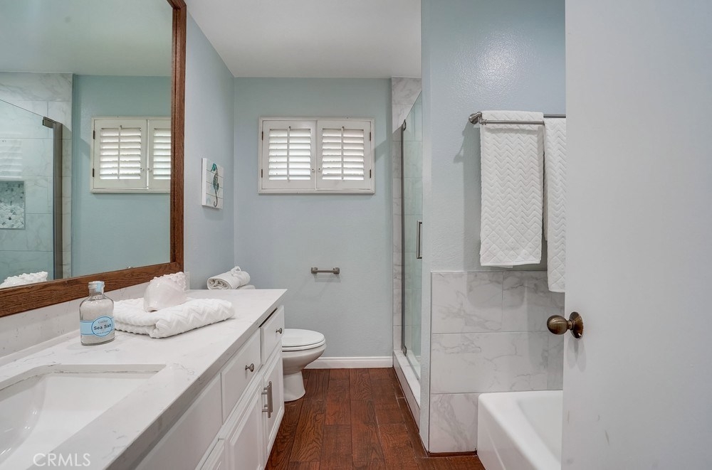 Welcome home to your move-in ready, graciously proportioned coastal oasis in the best of Santa Monica neighborhood. Located just minutes from the beach, the bluffs, the Santa Monica steps, and the abundant retail on Montana Ave, this 1 bedroom, 1 bathroom condo presents a warm and inviting open concept living room and dining room with charming built in shelves and natural light coming in through the plantation shutters. Enjoy the gas fireplace and convenient dry bar tucked away off the living room. The modern, updated kitchen comes with stainless steel appliances and fixtures, single slab quartz countertops, new cabinets, double ovens and a lovely nook that is ideal for your work from home office space. Throughout, you'll find refinished hardwood floors, dimmer recessed lighting, ample storage space, and contemporary finishes. The spaciousness of the bedroom is amplified by the walk-in closet. Other notable features include central heat/AC controlled by a Nest thermostat, private balcony with a barbecue, and a stylish chandelier. Located in the award-winning Roosevelt Elementary School area, the well maintained building boasts of controlled access, an elevator, gated parking, gym with a steam shower, billiard room, pleasant courtyard, and large rec room all with a low HOA. VIRTUAL TOUR HERE: https://my.matterport.com/show/?m=baqVvYmLqET&mls=1