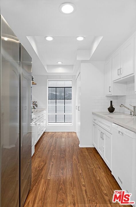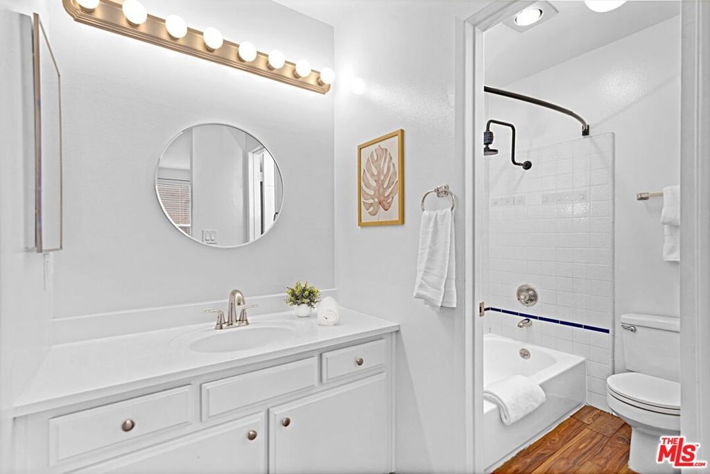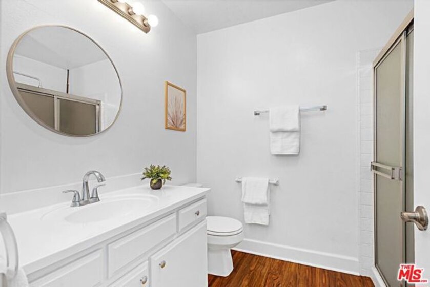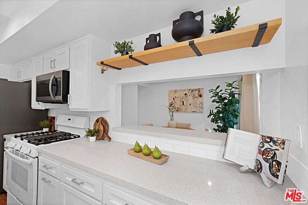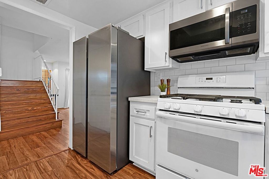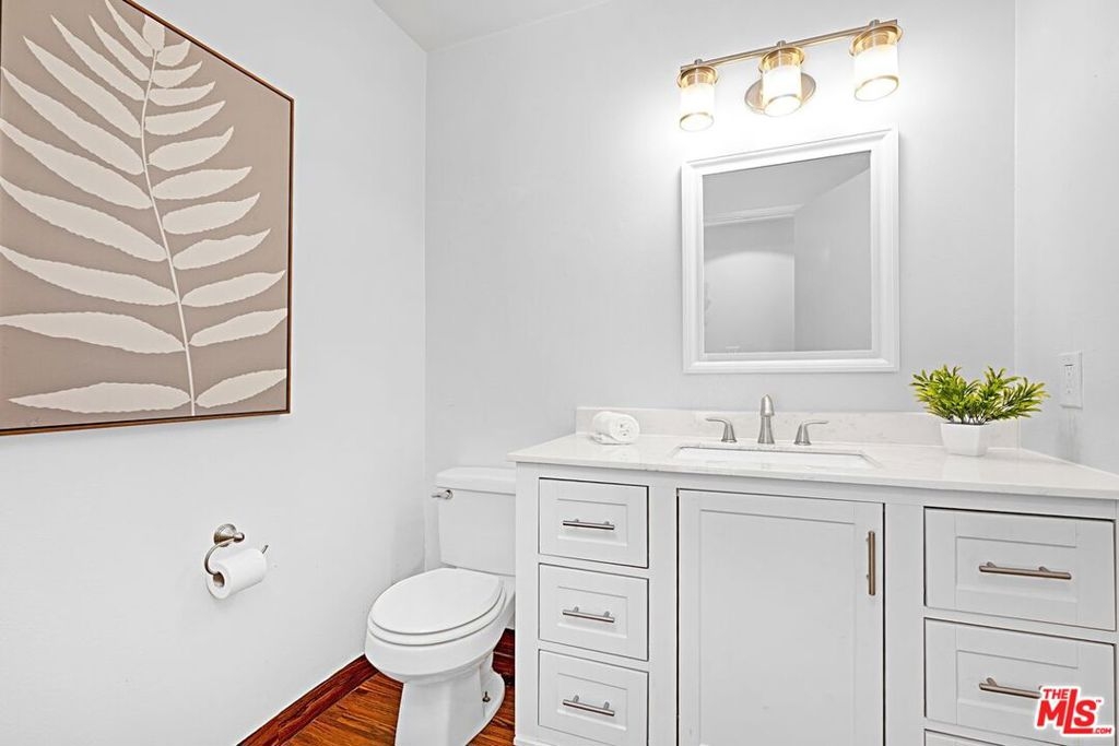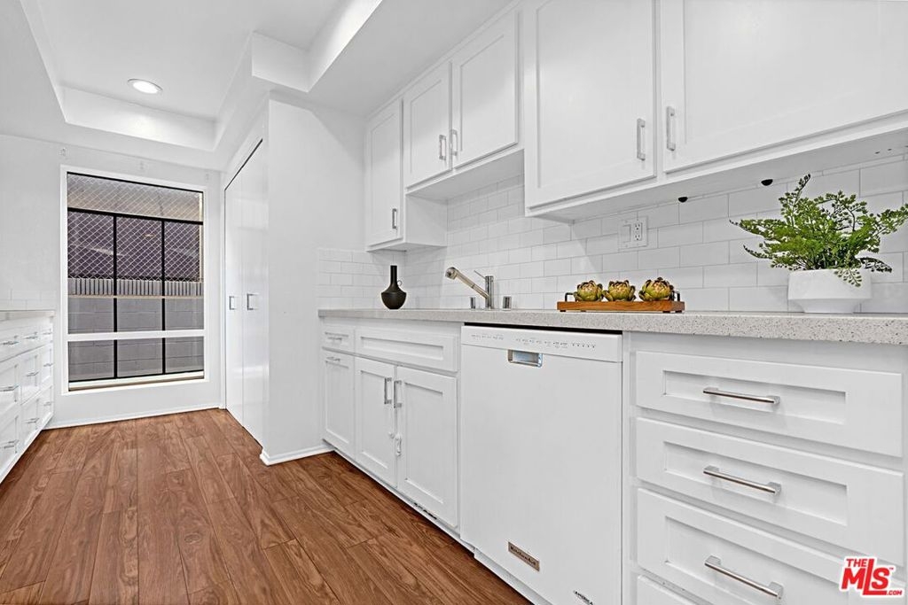 Light and bright 2-bedroom 2.5-bathroom townhouse-style condo in prime Santa Monica with great floorplan, close to many shops and restaurants. Some upgrades include newer wood-type flooring, recessed lighting, newer powder room vanity, large kitchen with garden window, full sized laundry and some stainless-steel appliances. Nice private patio off of the living room plus an additional balcony for more outdoor space, newer dual paned windows for improved insulation and quiet living, and lots of storage throughout. The downstairs has a multi=purpose room that can be used as an office/den/formal dining room. Large 1/2-bathroom downstairs. The two bedrooms upstairs are both ensuite with good-sized bathrooms, and the primary bedroom has extra closet space on two walls. very small building with only 6 units, with reasonable HOA fee and this beautiful complex underwent a $180,000 renovation not long ago. Two side-by-side, private parking spaces in a gated underground garage plus additional storage in garage, central air conditioning and forced air heat, and is located in the famous Santa Monica school system.