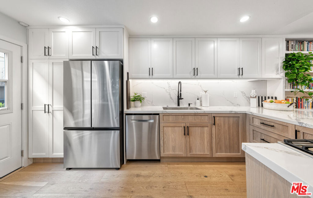 Stunning Designer Townhome, Full Custom Remodel in the Heart of Santa Monica. Discover this stunning and luxurious 3-bedroom, 2.5-bath designer townhome, fully reimagined with a complete custom remodel. Every inch has been thoughtfully curated with high-end finishes, blending modern elegance and functionality in a way that feels like your own private single-family home. Set within the esteemed Santa Monica-Malibu School District (Roosevelt Elementary, Lincoln Middle, and Santa Monica High) this residence is part of a charming, well-maintained, and lushly landscaped 7-unit complex with low HOA dues. Ideally located on a tree-lined street, you'll enjoy walkable access to all of Santa Monica's best offerings: boutique shopping on Montana, dining on Wilshire, Reed Park, Piper Preschool, the Fairmont, Rustic Canyon, Santa Monica Seafood, and of course, the Pacific Ocean just moments away. Inside, no expense was spared. The home showcases stunning hardwood floors, a gourmet custom kitchen with Bosch appliances, extensive built-in custom cabinetry, and sophisticated luxury lighting throughout. Spa-inspired bathrooms, two cozy fireplaces, and a library-style dining room add both comfort and character. With over 1,500 sq. ft. of living space, natural light floods through the home, highlighting its seamless indoor-outdoor flow. Multiple outdoor retreats invite year-round enjoyment of the coastal breeze including a private rooftop deck with sweeping city and mountain views, and additional patios with pet-friendly turf and upgraded drainage. The attached, direct-entry two-car garage features epoxy flooring and new custom storage cabinetry, making organization effortless. Outdoor storage cabinets and thoughtfully designed spaces add even more convenience. This rare townhome embodies the very best of Santa Monica coastal living: designer craftsmanship, a walkable beachside lifestyle, and a tranquil retreat in the heart of the city. Highlights: Full custom remodel with designer finishes throughout. Bosch high-end appliances & gourmet kitchen with custom cabinetry. Luxury lighting fixtures & extensive built-ins for maximum storage. Two fireplaces and over 1,500 sq. ft. of light-filled living space. Private rooftop deck with mountain & city views. Direct-entry 2-car garage with epoxy floors & built-in cabinetry. Located in the Santa Monica-Malibu School District, minutes to Montana Ave., Wilshire, Reed Park, brand new Equinox gym with rooftop pool, new Vons, Promenade, The Proper Hotel, and the beach