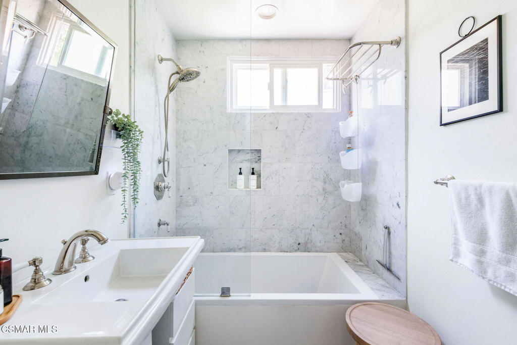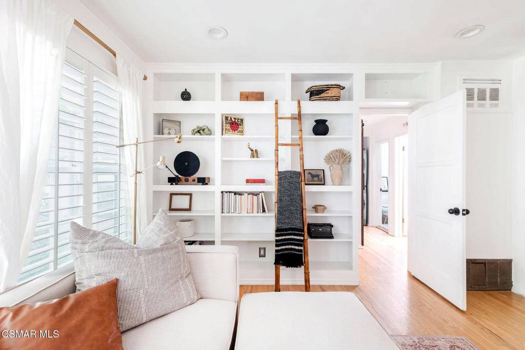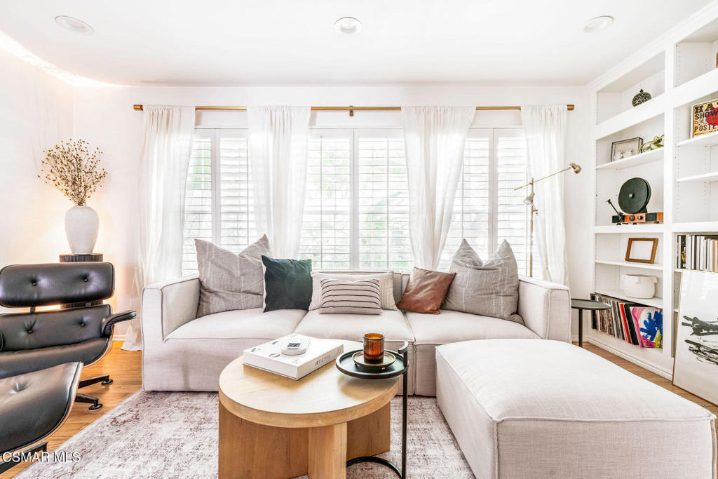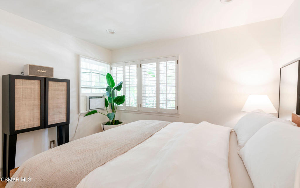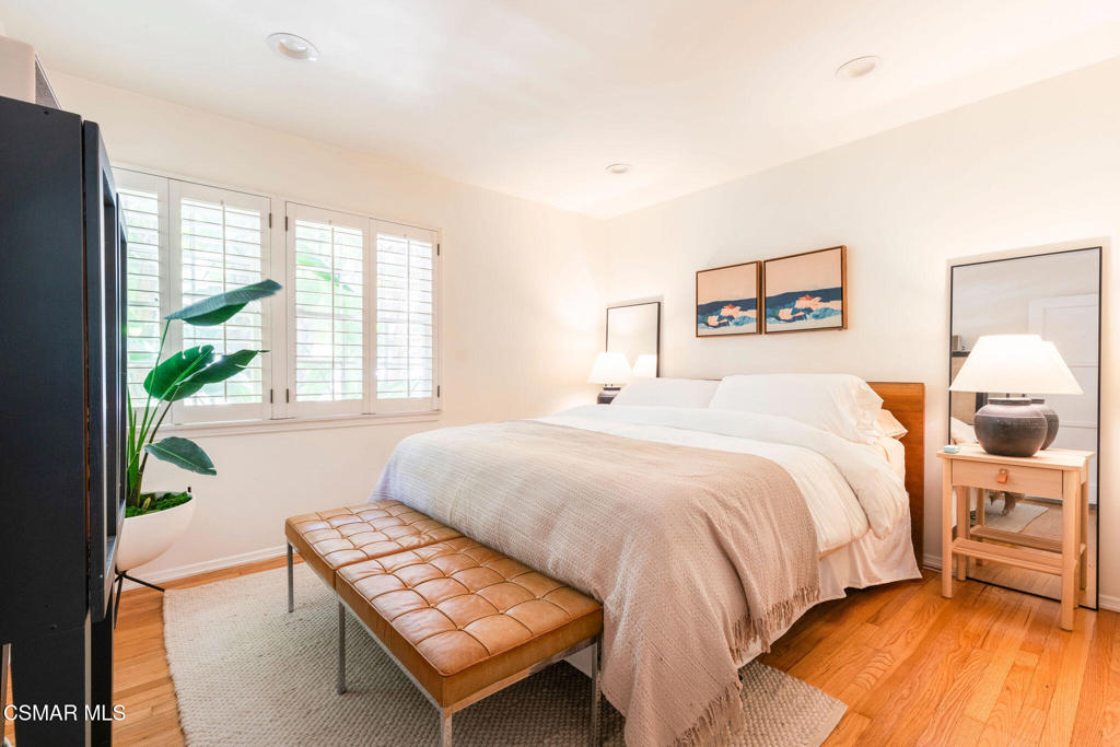 Welcome to this beautifully updated 2-bedroom, 1-bath condo in one of Santa Monica's most sought-after garden-style buildings. Set in a tranquil courtyard, this inviting ground-floor unit offers both seclusion and character. Surrounded by lush landscaping, mature trees, and inviting pathways that lead to serene patios-perfect for relaxing or entertaining guests. Inside, the spacious living room features a wall of windows, rich hardwood floors, and custom built-in bookcases, all bathed in natural light. The freshly painted interior is accented with recessed lighting and plantation shutters throughout. The remodeled kitchen is a showstopper with gleaming marble countertops, designer tile backsplash, top-tier stainless appliances, and a wine fridge - seamlessly opening to a large dining room with direct access to the rear patio area. Both bedrooms are generously sized. The luxurious bathroom includes marble finishes and an oversized soaking tub with shower. Additional highlights include in-unit washer and dryer, shared garage with one parking space and storage, plus a community laundry area and bike rack. Ideally located near shops, grocery stores, restaurants, parks, Santa Monica College, freeways, Third Street Promenade, Brentwood and minutes to the beach. This is a rare and special offering you won't want to miss!