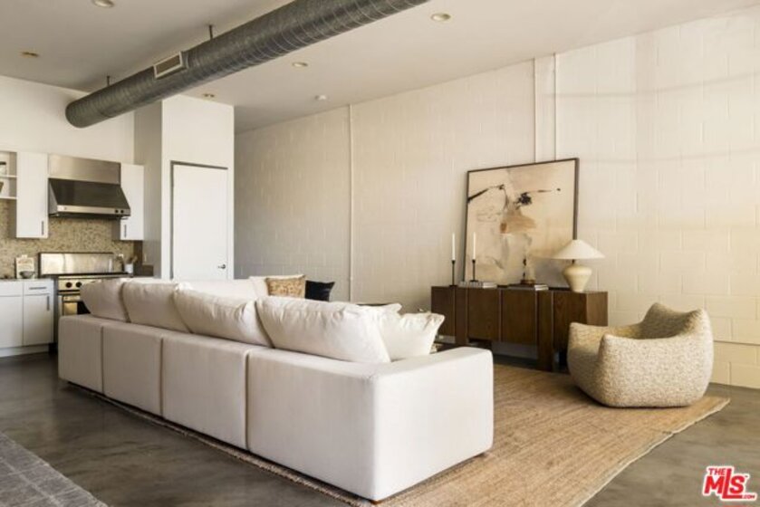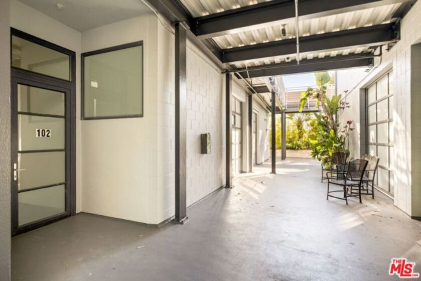 An architectural live-work loft designed by acclaimed architects Pugh + Scarpa, offering volume, character, and a modern sensibility. This ground-floor 1-bed, 2-bath residence blends industrial materials with a warm, organic palette, creating a refined setting for both living and working. The main great room opens in a dramatic sweep, with polished concrete floors, high ceilings, exposed steel, and an expansive wall of glass that frames mature greenery and soft, filtered light. Living, dining, and kitchen areas integrate seamlessly to create a multifunctional environment for everyday life, hosting, or creative work. The kitchen is efficient and well-composed, featuring stainless steel appliances, open shelving, and thoughtful storage. An east-facing patio sits just outside of the front door, extending the living space. The bedroom suite feels loft-inspired, with an operable garage-style door that introduces natural light and adds a distinctive architectural detail. The ensuite bath includes dual sinks, abundant storage, and a spacious walk-in shower. A second full bath adds guest-friendly convenience. Additional features include in-unit laundry, a storage room, and two side-by-side parking spaces with guest parking. Close to shops, dining, and the beach, this loft offers a relaxed, design-forward lifestyle with convenient access to the best of the Westside.