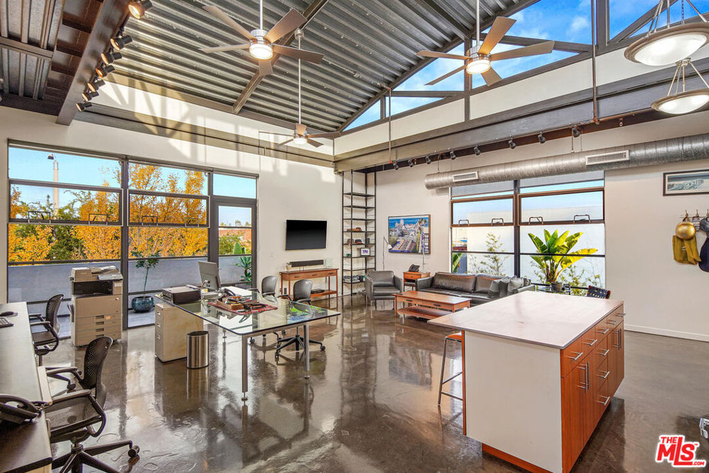 Just minutes from the beach in Santa Monica's Mid-City, this Pugh + Scarpa designed Live/Work loft offers industrial design features and an open floor plan infused with natural light. Enter to a sense of volume and hip contemporary style with polished concrete floors, large architectural windows and a coved metal ceiling with exposed beams and incredible height. Designed for both comfort and productivity, the main space features a living area and home office/studio with built-in shelving, along with access to a spacious balcony with plenty of room for outdoor entertaining. The eat-in kitchen is well equipped with modern stainless steel appliances and countertops, custom designer cabinetry and a large center island. The primary suite offers abundant closet space and a generously sized ensuite bath with double-vanity and oversized step-in shower. A guest bathroom with soaking tub and in-suite laundry complete this sleek and sophisticated unit. Zoned for Live/Work, the loft provides a mul