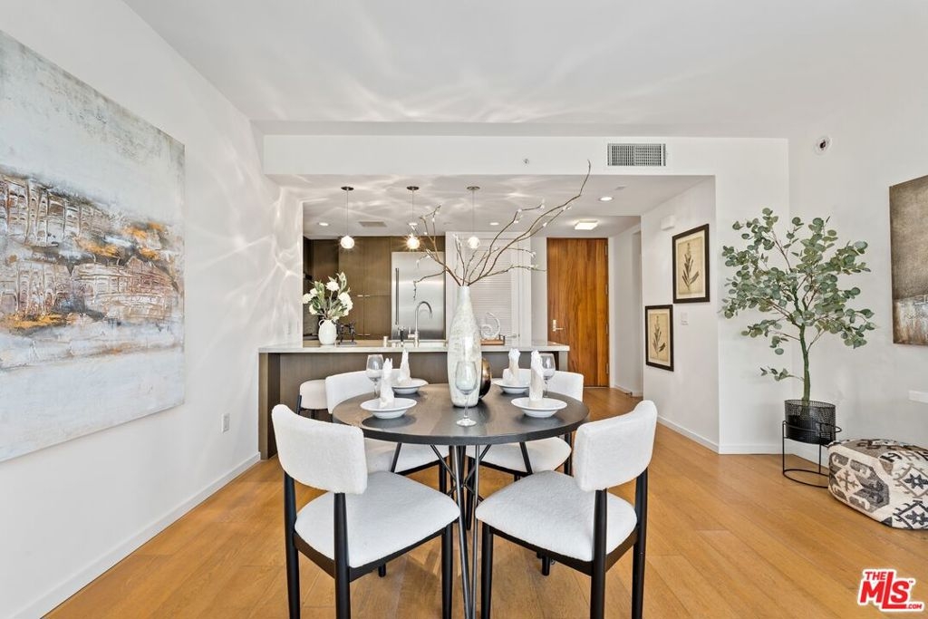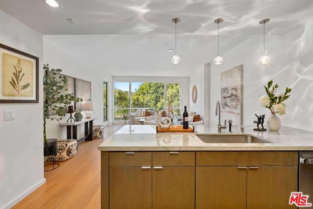 This beautifully designed one-bedroom, two-bath home features an open floor plan with floor-to-ceiling windows framing serene views of Tongva Park and filling the space with natural light. The chef's kitchen showcases Thermador stainless steel appliances, Sea Pearl quartzite countertops, and custom oak cabinetry, seamlessly connecting to the spacious living and dining areas that open to a private park-facing terrace. The primary suite offers peaceful park views, ocean breezes, a walk-in closet, and a spa-inspired bathroom with dual vanities, soaking tub, and glass-enclosed shower. Additional highlights include hardwood floors throughout, in-unit washer and dryer, two side-by-side parking spaces, and a private storage unit.Residents enjoy five-star amenities including a 24-hour concierge, state-of-the-art fitness center, and exclusive access to the Skybridge Lounge with a full kitchen, fireplace, BBQ, and sweeping ocean views. There's also a convenient pet spa and shower area perfect for rinsing off after a day at the beach. Perfectly located moments from Santa Monica Beach, The Pier, 3rd Street Promenade, and world-class dining, this residence defines modern coastal living at its finest.