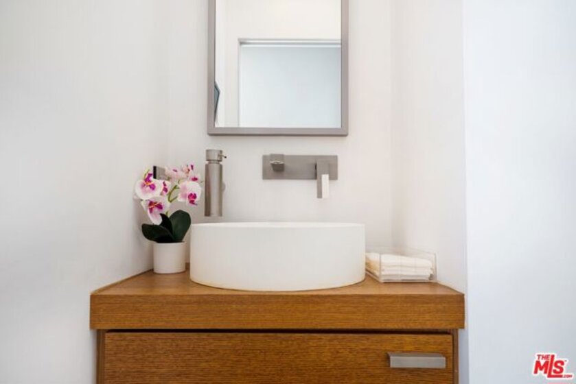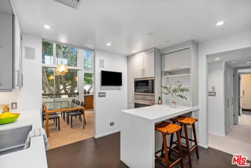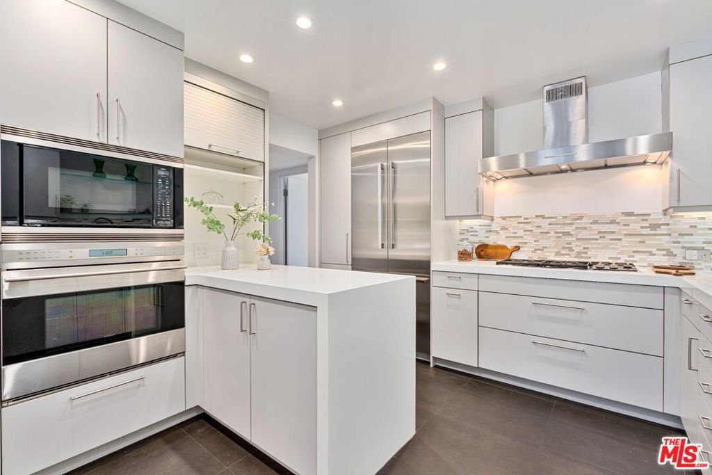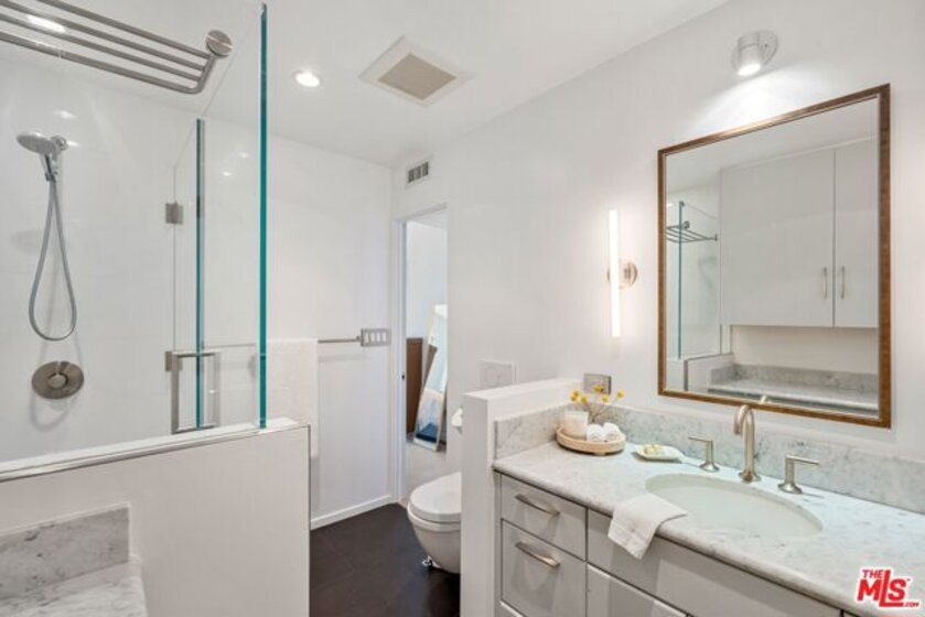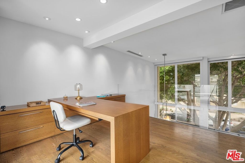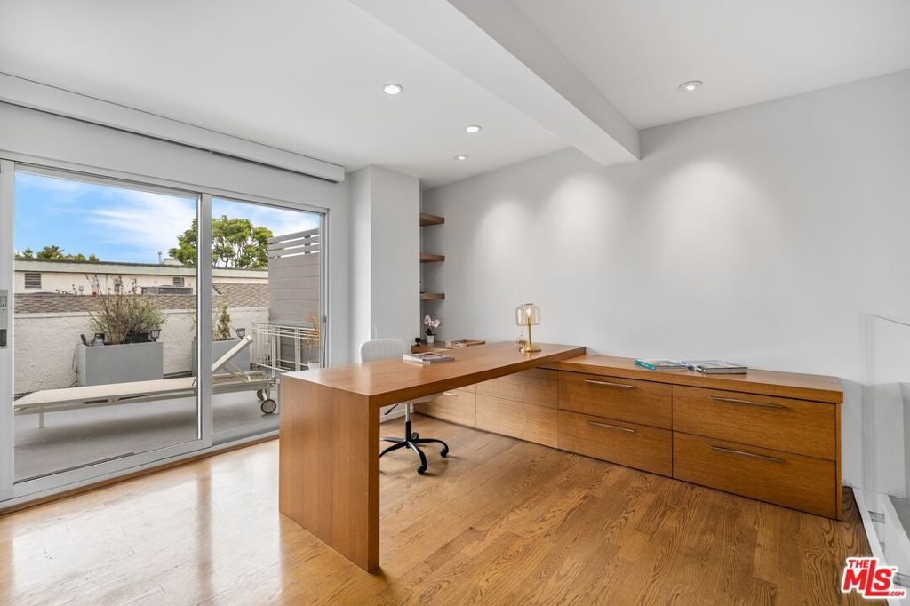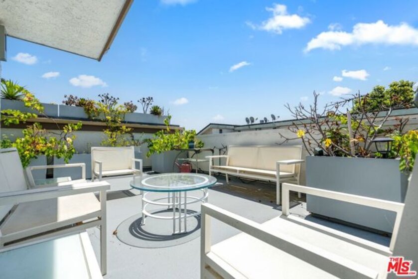 Only 3 blocks from Santa Monica's renowned Montana Avenue, this remodeled penthouse offers 2 bedrooms, 3 baths, a loft office, and a private 500 square foot rooftop deck all designed for elevated coastal living. Framed by lush greenery, the expansive 2-story living and dining areas offer serene privacy through oversized windows, anchored by a custom architect-designed fireplace. The chef's kitchen features poured glass countertops, premium appliances, a breakfast area, and a wine cooler. Two spacious bedroom suites occupy the lower level, each with en-suite baths, while the upper floor boasts a versatile third bedroom/office space, a powder room, and a light-filled loft with a built-in two-person partner's desk. A sprawling, sun-drenched rooftop deck framed by lemon & fig trees, fragrant blooms & herbs and privacy fencing is perfect for entertaining or unwinding with a cocktail under the stars. Bonus features include a private gym (or storage) accessible from the rooftop deck, custom built-ins in the living room and bedroom. Included are two parking spaces and additional storage. Low HOA dues! [The room currently being used as an office has a closet and there is an adjacent one-half bath, and that room has been used as a bedroom (which could serve as a third bedroom)]