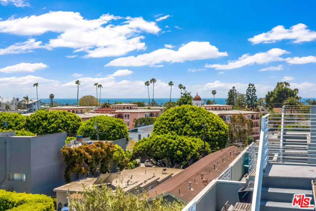 Panoramic 360 Ocean, Mountain & City Views. This sun-drenched, architecturally inspired two bedroom, 3 bath, plus a spacious loft (easily a third bedroom) features soaring 16-foot ceilings & walls of windows that flood the home with tons of natural light, along with three private outdoor spaces, including two rooftop decks with direct ocean views. The open living area showcases white oak floors, motorized shades, & a chef's kitchen, with high-end appliances (Thermador, Fisher-Paykel), quartz countertops & custom cabinetry, creating a dramatic centerpiece for entertaining & everyday living. The loft overlooks the main space, capturing breathtaking views and dramatic sunsets, with a full bath on the main level, functioning seamlessly as a third bedroom. Both bedrooms include their own en-suites, & the primary bedroom enjoys a private outdoor patio. All bathrooms are thoughtfully appointed with quartz counters & a custom vanity. Located in an intimate four-unit building with great neighbors, the home includes side-by-side parking in a secure underground garage, an additional storage unit, security cameras, smart thermostats, & HOA dues that include earthquake insurance, building insurance, water, sewer, trash & gardening. Just six blocks from the beach & vibrant Main Street & only two blocks from the dog park in this pet-friendly building. This rare offering combines modern luxury, security, & unbeatable coastal living, with furnishings available for a turnkey experience.