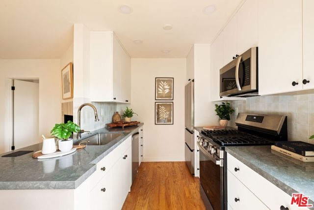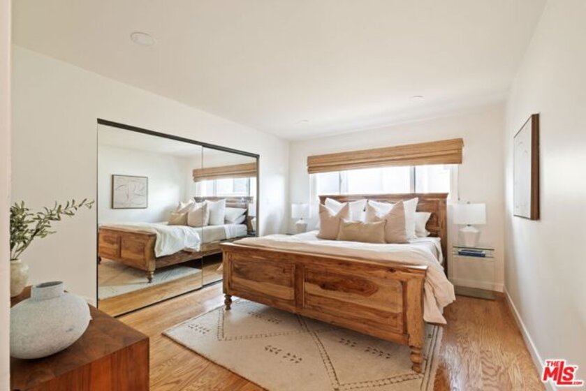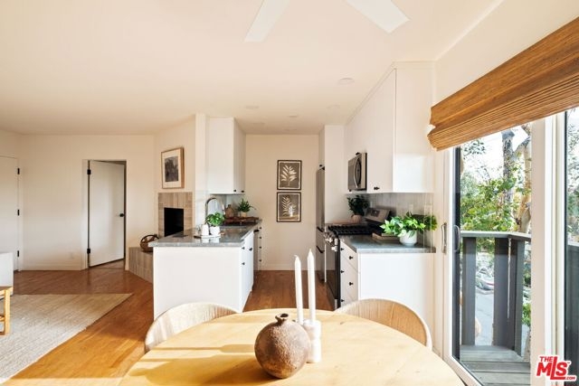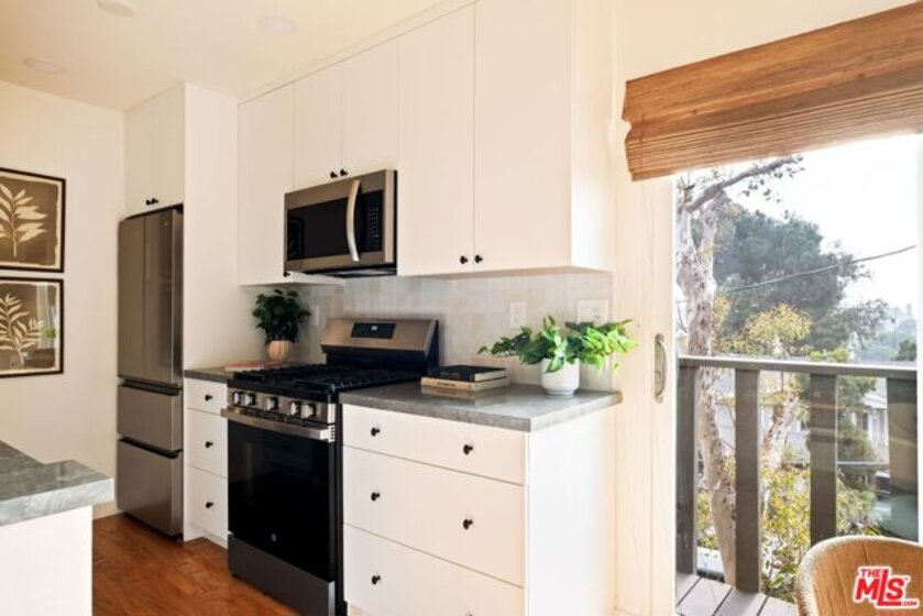 This top-floor unit has so much to offer. Thoughtfully remodeled with warm neutral finishes and authentic hardwood floors. Enter into the open and serene space that includes room for your favorite sofa, a perfect spot to situate the dining table to enjoy the calming ocean views, and a designated office nook. Mature trees envelope this space, offering a canopy of nature outside the two sets of sliding doors that lead to a quaint wrap-around deck. The kitchen holds all new stainless steel appliances and a window for the breeze to cool the coolest of guests. After sunset, you can light a fire, wind down. Two spacious, wood-floored bedrooms with custom closets, ample and efficient custom storage to tuck away your belongings, and move on with the day! Perfectly situated custom tiled bathrooms and an all-in-one washer/dryer complete the thoughtful details in this unit; this is a home. This convenient location offers parking in the garage and storage. Leave your car at home while you explore the beach and all the amazing shops and restaurants within moments. Light, location, and ocean views. This unit has it all!