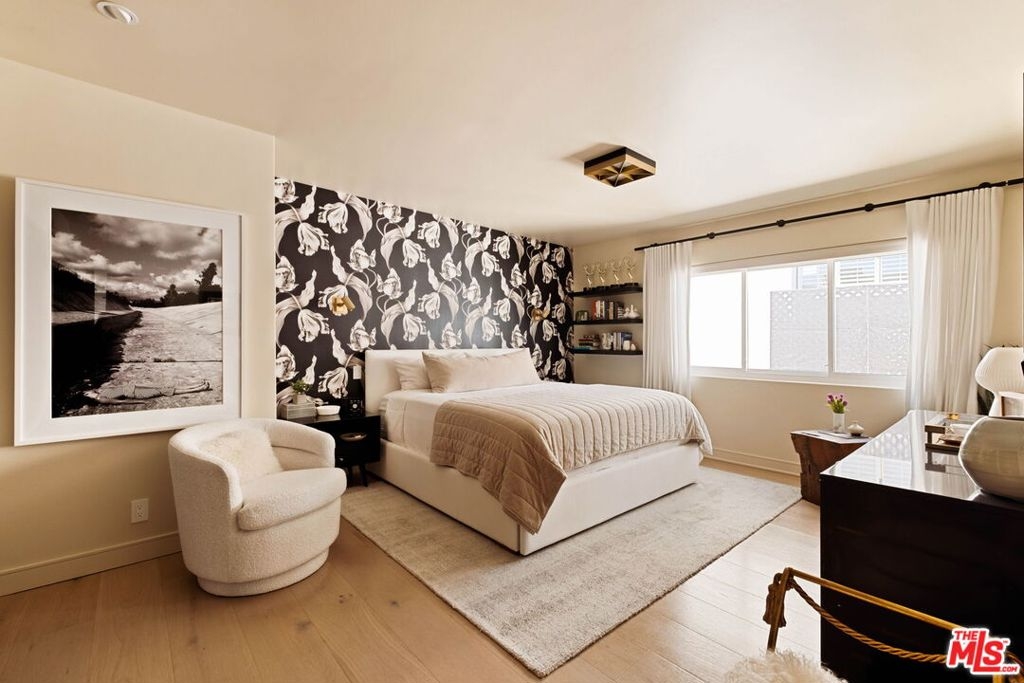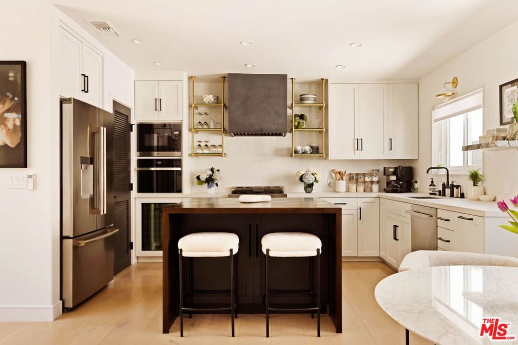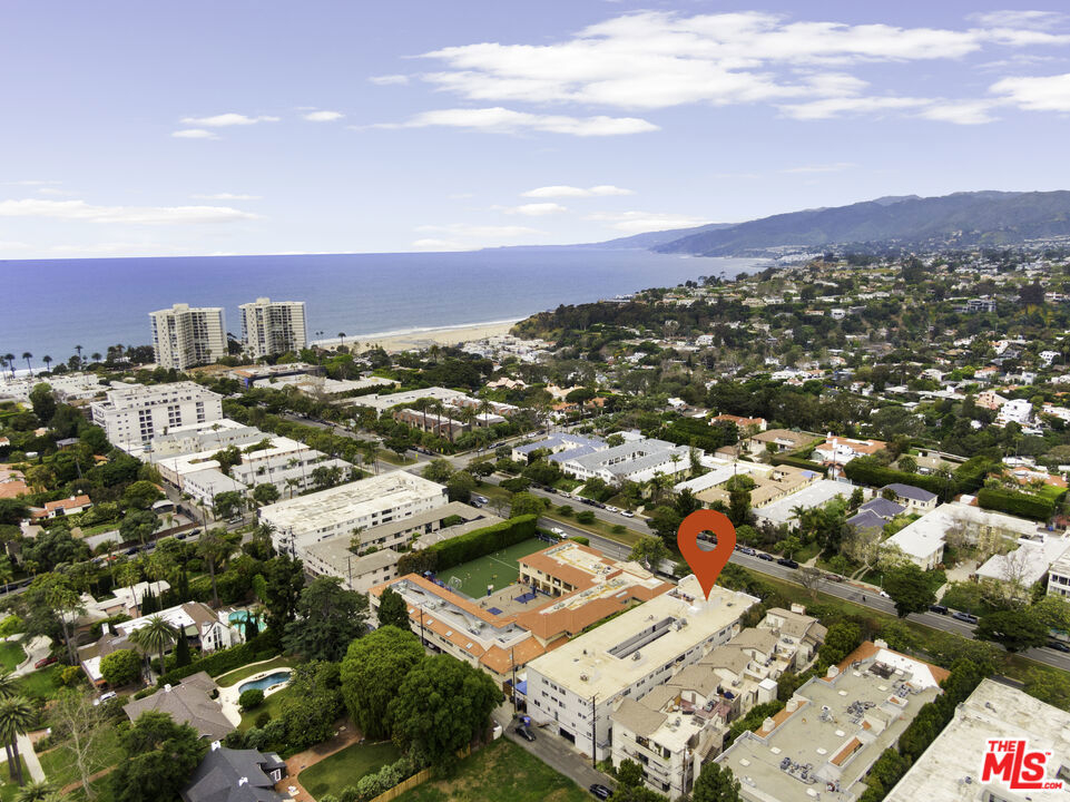 A remarkable top-floor designer-remodeled penthouse in one of Santa Monica's most sought-after neighborhoods, just moments from the beach, the Santa Monica Stairs, Montana Avenue shops, Palisades Park, and more. Fully remodeled and curated by the current owner for her own use, this exceptional residence reflects a level of detail and finish typically reserved only for multi-million-dollar homes. A formal entry leads to an open-concept floor plan with a sleek gourmet kitchen featuring custom cabinetry, top-of-the-line appliances including a chef's gas range and oven, built-in steam oven, microwave, and wine fridge, plus custom brass and glass shelving, a honed marble backsplash, and a granite waterfall island with breakfast bar and extra storage. The kitchen flows seamlessly into a built-in dining nook, spacious living room, and balcony made for lounging. The luxe, spa-like bathroom is richly finished with a floating oak vanity, double shower heads, jacuzzi tub, designer mosaic tile, and high-end fixtures and hardware. The oversized bedroom offers space for a king-sized bed, plus space for a home office, exercise, or sitting area. Additional upgrades include new windows with motorized shades, new lighting, new electrical panel, wide-plank Italian oak floors, custom oak interior doors and molding, air conditioning, and in-unit laundry. Larger than many two-bedroom units, this top floor, one-bedroom condo is flooded with natural light from multiple exposures. Set within a coveted and secure building, the property also enjoys lush landscaping, a panoramic rooftop deck, one secure parking space, and extra storage. HOA dues are $690 per month and include water, sewer, trash and earthquake insurance. Nothing short of spectacular!