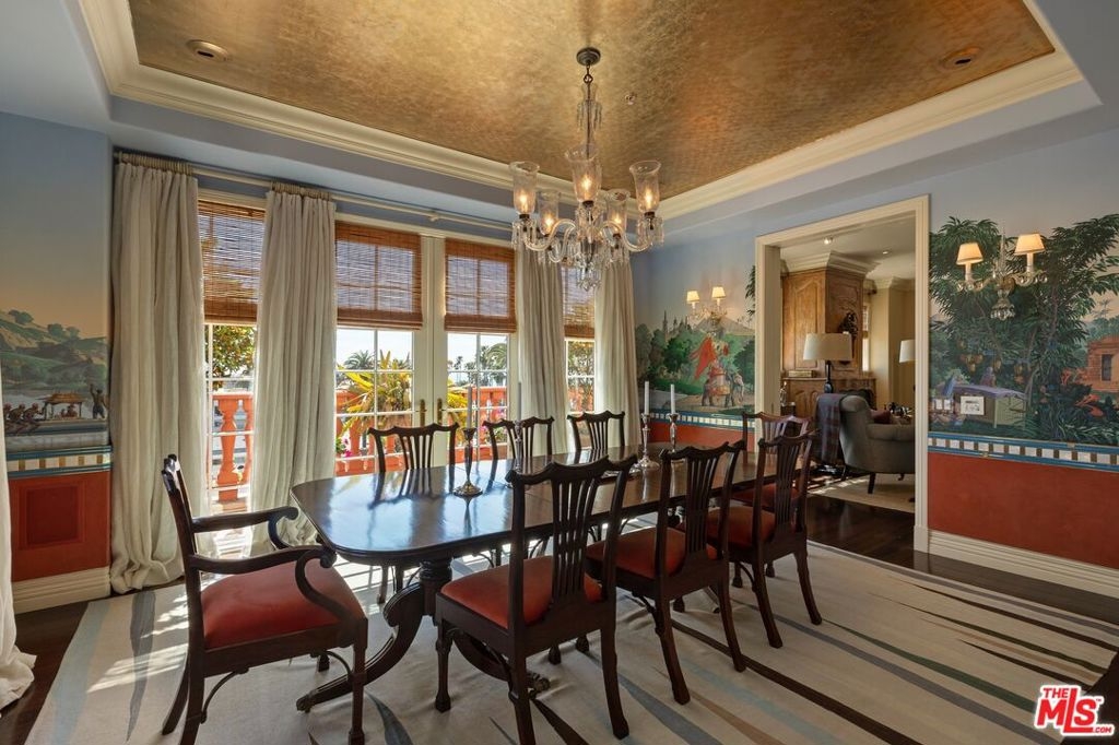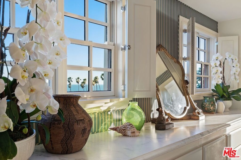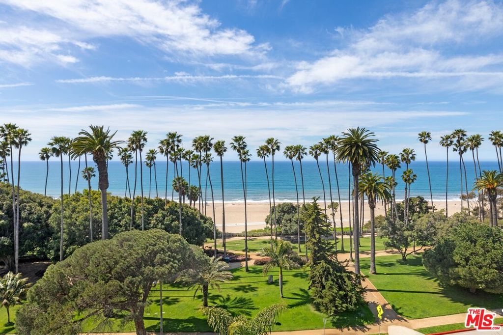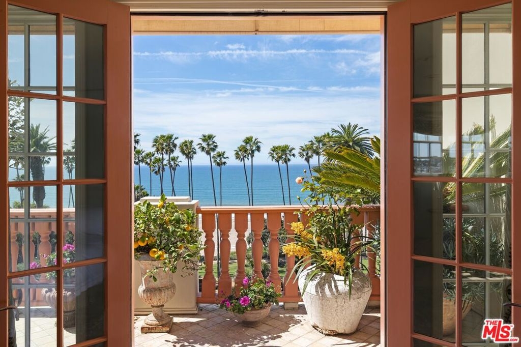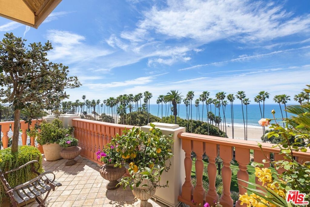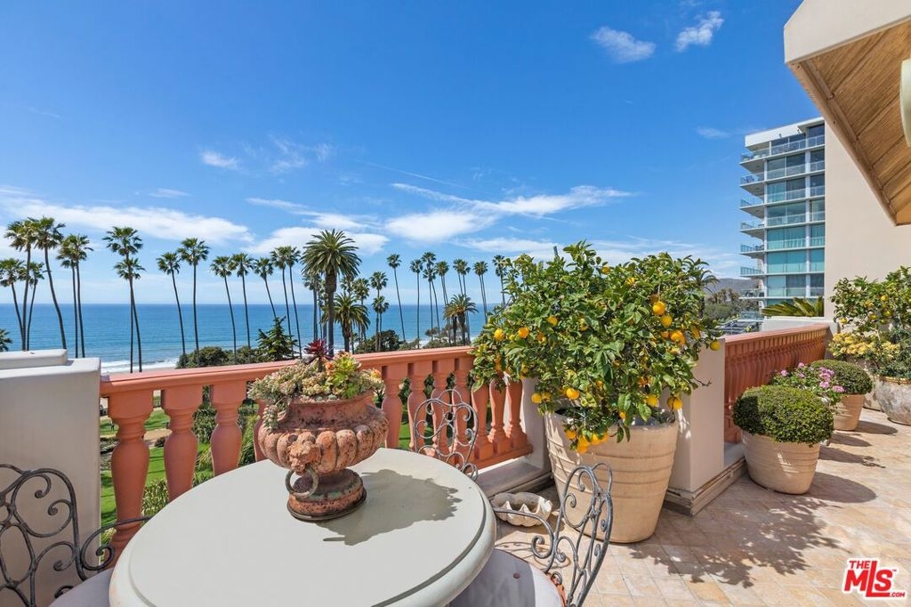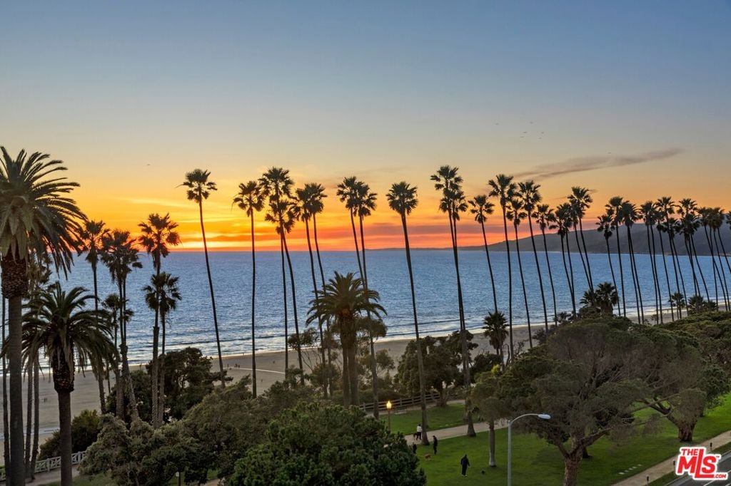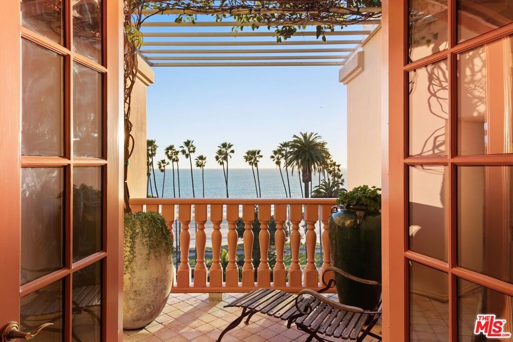 Originally built in 1928 and meticulously reconstructed in 1996, the historic El Tovar By The Sea seamlessly blends three distinct architectural periods: Classical Revival, Streamline Moderne, and Modified Classical Mediterranean. Nestled on the upper central end of Ocean Avenue, this full-service luxury building remains one of the most coveted addresses, and its 22 residences are among the most exclusive. Sitting above them all is the coveted jewel of the property - Penthouse South. Upon entering the exquisitely appointed foyer, the elevator will take you directly to a silk wallpaper-lined vestibule where your front door awaits. Step inside to be greeted by breathtaking ocean vistas and a sun-drenched living room bathed in southern light. French doors open onto a sweeping wrap-around balcony to take in the ocean air and watch the palm trees sway in serene privacy.The high ceilings and designer details complement this striking space that is as suitable for entertaining as it is for a quiet night at home by the wood burning fire. The formal dining room boasts Zuber hand-painted wallpaper, gold leaf ceiling, and views of the coast through the kumquat trees on the patio. The spacious kitchen with a generous island features top-of-the-line appliances, a separate butlers pantry providing ample storage, and a large adjacent laundry room. An elegant powder room with an antique vanity completes the first floor. Venture upstairs to discover the secluded sleeping quarters. The en-suite guest room features stunning views of the snow-capped mountains and two large closets. Down the hall, the spectacular primary suite beckons - here, you will feel transported as you look out from Palos Verdes to Point Dume and hear the gentle roar of waves as the sound cascades from the ocean. Step out onto the large balcony with separate sitting areas for sunny afternoon reading. Drift back inside and envision yourself immersed in another world as you enjoy the bedroom's fireplace before turning in for the night. The spa-like primary bath features Venetian plaster walls, soaking tub, and steam shower. A separate office space with views and balcony provides the ideal setting for your virtual work or a private space for study. Solid oak hardwood floors throughout underscore the grandeur of every detail. The home includes private 3 plus car garage with custom built-in storage cabinets. The building's state-of-the-art fitness center, pool, spa, and lush landscaping rival those of 5 star hotels. Situated along the bluffs of Palisades Park and just a short stroll from shops and restaurants - this is California living at it's finest and steeped in the history of iconic Ocean Avenue. When you are here, you are truly home
