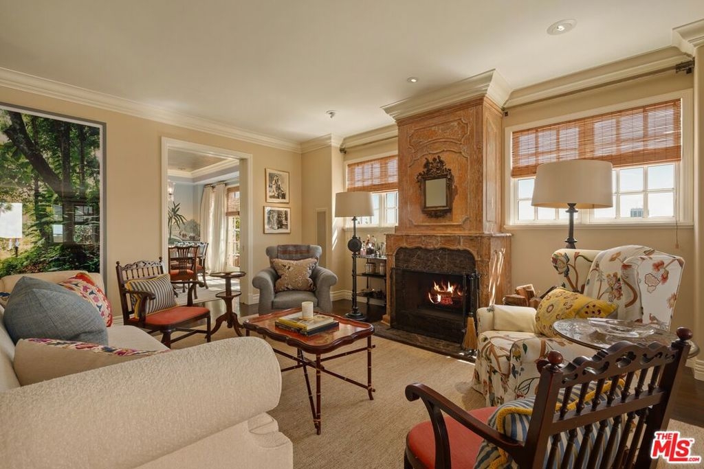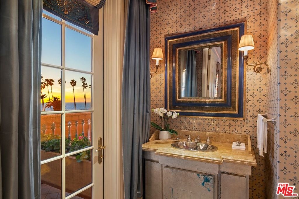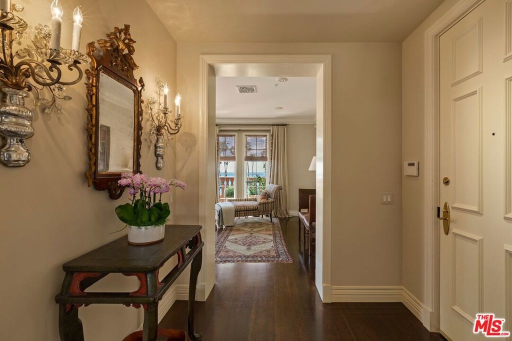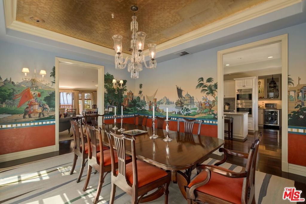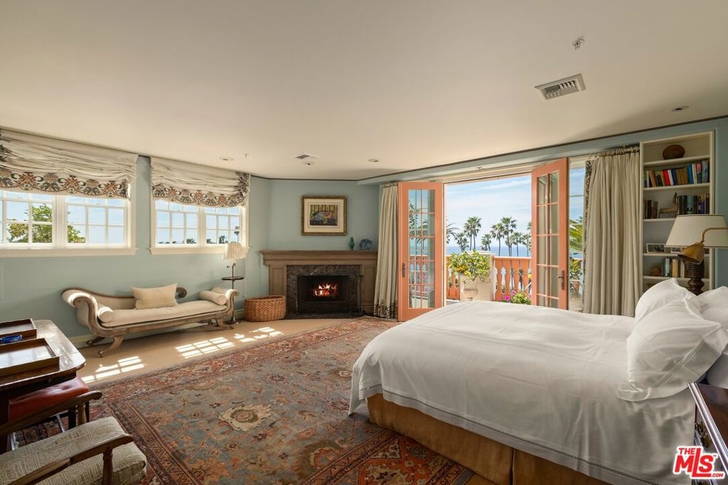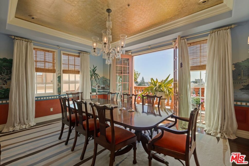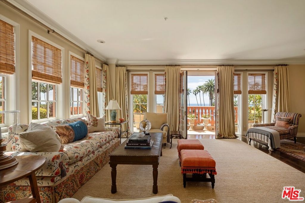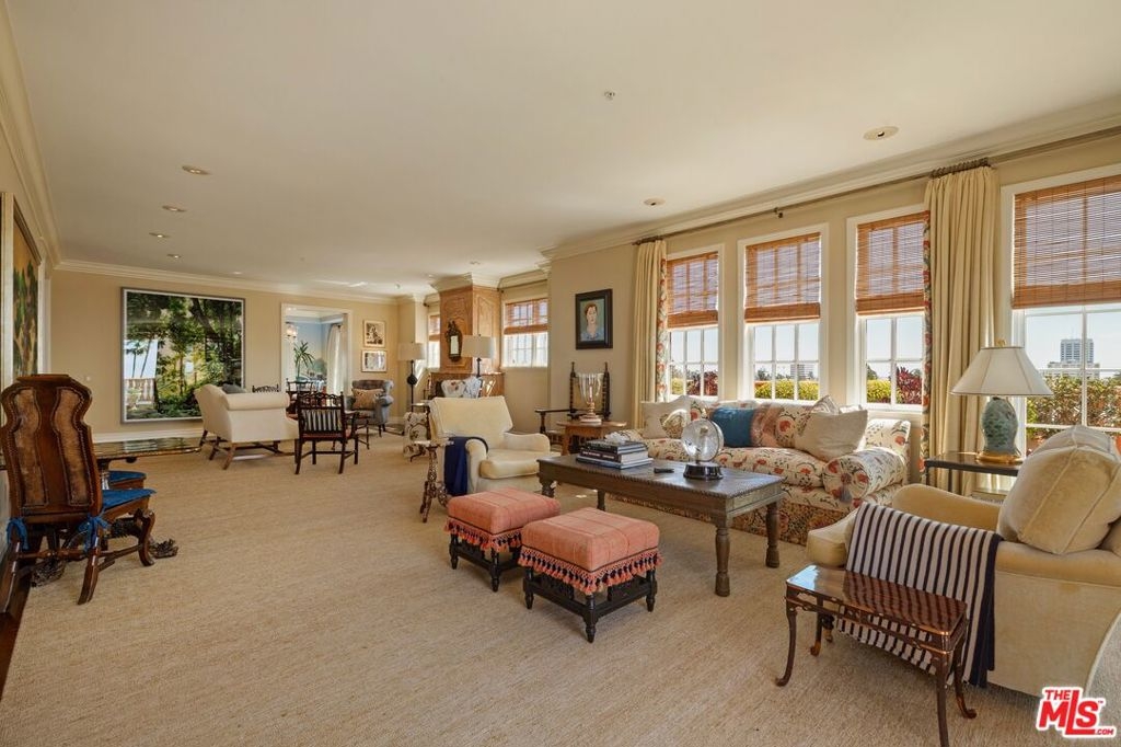 Originally built in 1928 and meticulously reconstructed in 1996, the historic El Tovar By The Sea seamlessly blends three distinct architectural periods: Classical Revival, Streamline Moderne, and Modified Classical Mediterranean. Nestled on the upper central end of Ocean Avenue, this full-service luxury building remains one of the most coveted addresses, and its 22 residences are among the most exclusive. Sitting above them all is the coveted jewel of the property - Penthouse South. Upon entering the exquisitely appointed foyer, the elevator will take you directly to a silk wallpaper-lined vestibule where your front door awaits. Step inside to be greeted by breathtaking ocean vistas and a sun-drenched living room bathed in southern light. French doors open onto a sweeping wrap-around balcony to take in the ocean air and watch the palm trees sway in serene privacy.The high ceilings and designer details complement this striking space that is as suitable for entertaining as it is for a quiet night at home by the wood burning fire. The formal dining room boasts Zuber hand-painted wallpaper, gold leaf ceiling, and views of the coast through the kumquat trees on the patio. The spacious kitchen with a generous island features top-of-the-line appliances, a separate butlers pantry providing ample storage, and a large adjacent laundry room. An elegant powder room with an antique vanity completes the first floor. Venture upstairs to discover the secluded sleeping quarters. The en-suite guest room features stunning views of the snow-capped mountains and two large closets. Down the hall, the spectacular primary suite beckons - here, you will feel transported as you look out from Palos Verdes to Point Dume and hear the gentle roar of waves as the sound cascades from the ocean. Step out onto the large balcony with separate sitting areas for sunny afternoon reading. Drift back inside and envision yourself immersed in another world as you enjoy the bedroom's fireplace before turning in for the night. The spa-like primary bath features Venetian plaster walls, soaking tub, and steam shower. A separate office space with views and balcony provides the ideal setting for your virtual work or a private space for study. Solid oak hardwood floors throughout underscore the grandeur of every detail. The home includes private 3 plus car garage with custom built-in storage cabinets. The building's state-of-the-art fitness center, pool, spa, and lush landscaping rival those of 5 star hotels. Situated along the bluffs of Palisades Park and just a short stroll from shops and restaurants - this is California living at it's finest and steeped in the history of iconic Ocean Avenue. When you are here, you are truly home
