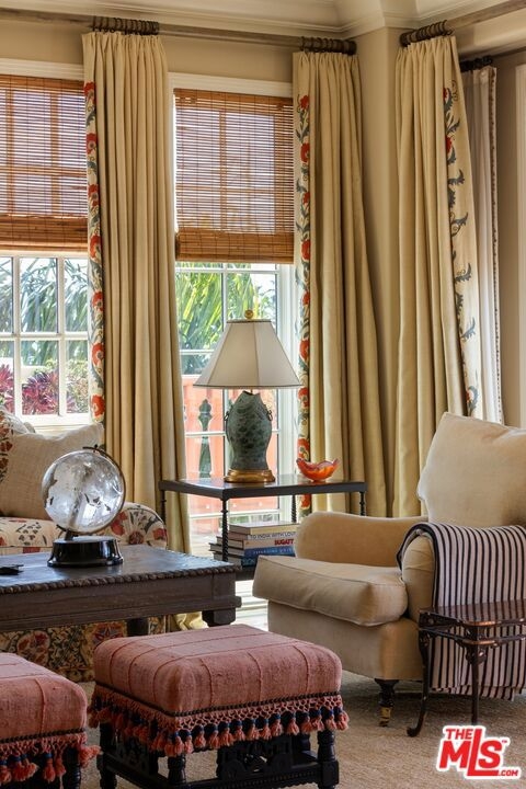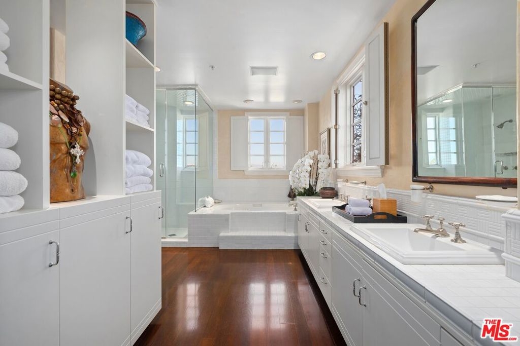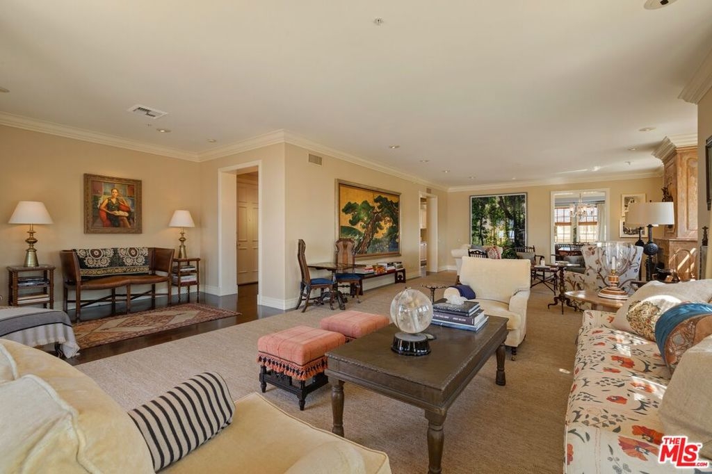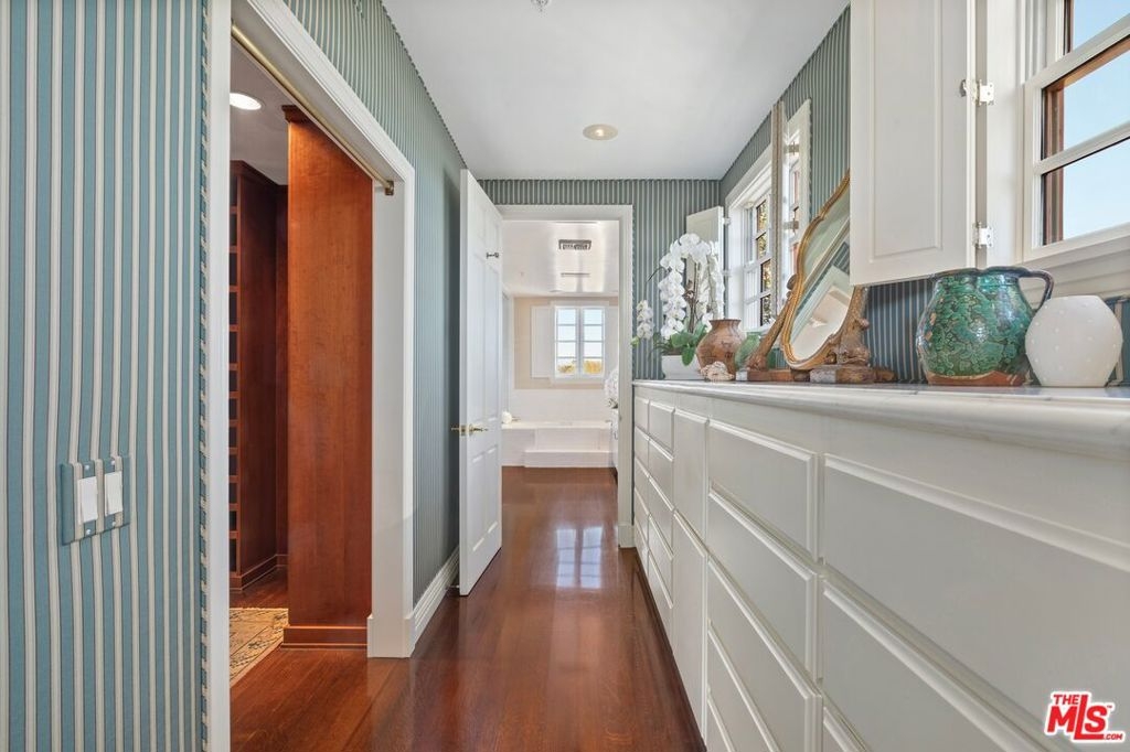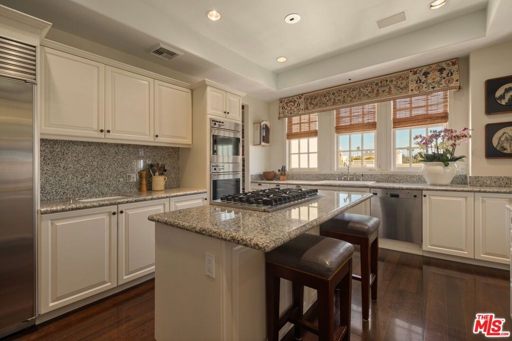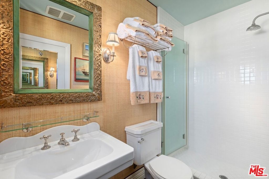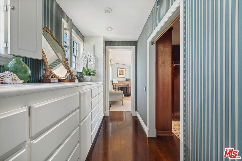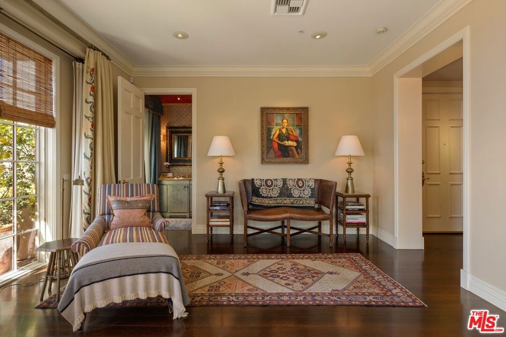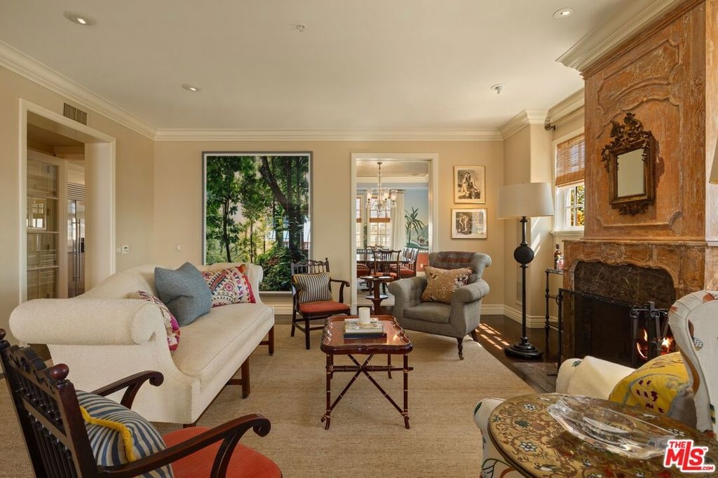 Originally built in 1928 and meticulously reconstructed in 1996, the historic El Tovar By The Sea seamlessly blends three distinct architectural periods: Classical Revival, Streamline Moderne, and Modified Classical Mediterranean. Nestled on the upper central end of Ocean Avenue, this full-service luxury building remains one of the most coveted addresses, and its 22 residences are among the most exclusive. Sitting above them all is the coveted jewel of the property - Penthouse South. Upon entering the exquisitely appointed foyer, the elevator will take you directly to a silk wallpaper-lined vestibule where your front door awaits. Step inside to be greeted by breathtaking ocean vistas and a sun-drenched living room bathed in southern light. French doors open onto a sweeping wrap-around balcony to take in the ocean air and watch the palm trees sway in serene privacy.The high ceilings and designer details complement this striking space that is as suitable for entertaining as it is for a quiet night at home by the wood burning fire. The formal dining room boasts Zuber hand-painted wallpaper, gold leaf ceiling, and views of the coast through the kumquat trees on the patio. The spacious kitchen with a generous island features top-of-the-line appliances, a separate butlers pantry providing ample storage, and a large adjacent laundry room. An elegant powder room with an antique vanity completes the first floor. Venture upstairs to discover the secluded sleeping quarters. The en-suite guest room features stunning views of the snow-capped mountains and two large closets. Down the hall, the spectacular primary suite beckons - here, you will feel transported as you look out from Palos Verdes to Point Dume and hear the gentle roar of waves as the sound cascades from the ocean. Step out onto the large balcony with separate sitting areas for sunny afternoon reading. Drift back inside and envision yourself immersed in another world as you enjoy the bedroom's fireplace before turning in for the night. The spa-like primary bath features Venetian plaster walls, soaking tub, and steam shower. A separate office space with views and balcony provides the ideal setting for your virtual work or a private space for study. Solid oak hardwood floors throughout underscore the grandeur of every detail. The home includes private 3 plus car garage with custom built-in storage cabinets. The building's state-of-the-art fitness center, pool, spa, and lush landscaping rival those of 5 star hotels. Situated along the bluffs of Palisades Park and just a short stroll from shops and restaurants - this is California living at it's finest and steeped in the history of iconic Ocean Avenue. When you are here, you are truly home