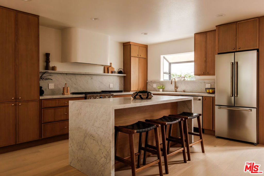 Ideally located just a half block South of Montana Ave., this beautifully remodeled Santa Monica townhome offers a sophisticated blend of modern upgrades and comfortable living. Thoughtfully and comprehensively renovated, the residence features three bedrooms and two and a half baths, with oak floors flowing throughout the home. The open-concept floor plan centers around a chef's kitchen and spacious great room, designed for both everyday living and effortless entertaining. The kitchen is appointed with a full suite of Thor appliances, wine cooler, generous counter space, beautiful cabinetry and a seamless connection to the living and dining areas. A separate office nook provides a dedicated workspace ideal for working from home. Two private patios extend the living spaces to the outdoors, creating peaceful areas for entertaining or relaxing. Upstairs, there are three bedrooms, each with generous closet space offering flexibility for family, guests, or additional workspace. Newly renovated bathrooms include a spacious primary bath with a marble dual vanity and a walk-in shower with dual shower heads. Additional amenities include a private 2-car direct-access garage and ample storage closets. Situated in the Franklin school district within one of Santa Monica's most sought-after neighborhoods, just steps from Montana Ave. shops and dining, and a short stroll to Palisades Park and the beach, this turn-key townhome combines thoughtful design, quality upgrades, and an exceptional location.
