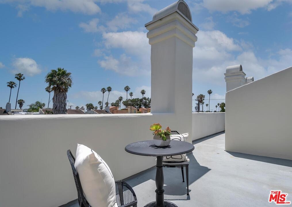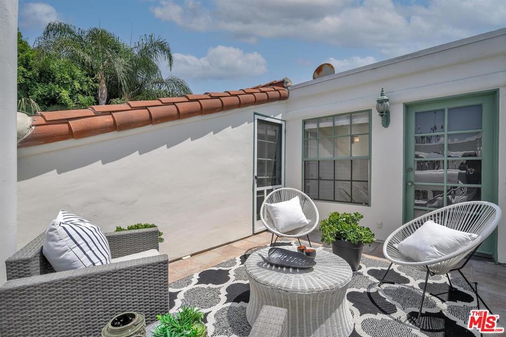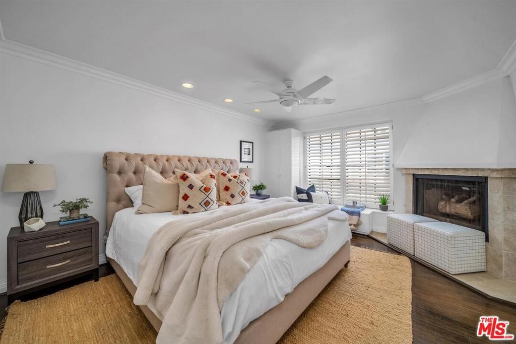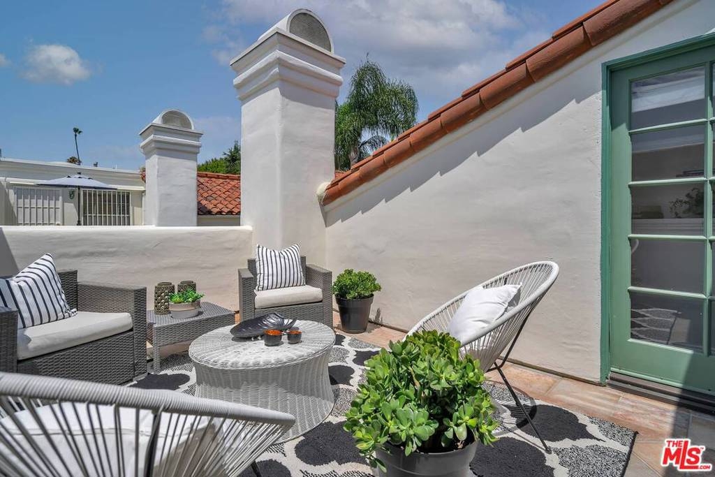 Bright and graciously appointed townhome in prime Santa Monica location near Montana Avenue. Enter through romantic, Spanish-tiled courtyard with a fountain and mature palm trees to an open living space with high ceilings, fireplace, hardwood floors, wet-bar powder room, and abundant natural light. Large patio set-off dining area affords indoor/outdoor entertaining and relaxation. Kitchen with Viking and Bosch stainless steel appliances and Grohe fixtures also has built-in bench and storage for a cozy eat-in setting, perfect for coffee and company. Upstairs the primary bedroom has its own fireplace, walk-in closet, and remodeled bathroom with marble double vanity and invitingly sized shower. Second bedroom with vaulted ceiling, en-suite bathroom, and walk-in closet. Light floods through the large skylight at the top of the stairwell and leads to a landing that is large enough for a small desk or reading nook and a den/office with two rooftop decks, nicely sized with treetop and peek-a-boo ocean view. There is also a large two-car garage with semi-private entry. A wonderful home that feels spacious and inviting, private and secure. Thoughtful details and upgrades throughout.