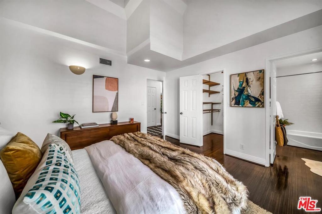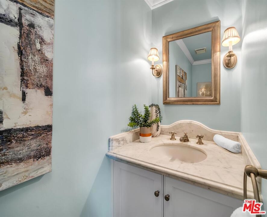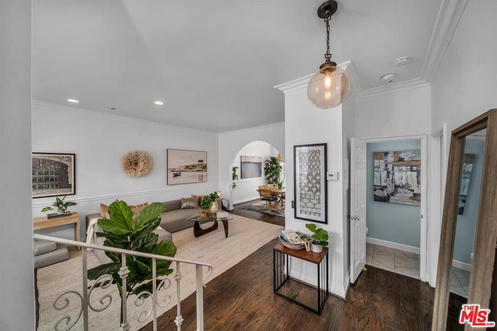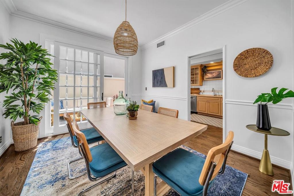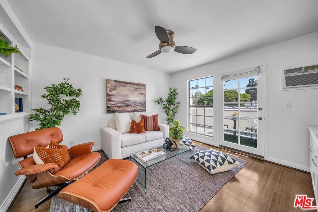 Bright and graciously appointed townhome in prime Santa Monica location near Montana Avenue. Enter through romantic, Spanish-tiled courtyard with a fountain and mature palm trees to an open living space with high ceilings, fireplace, hardwood floors, wet-bar powder room, and abundant natural light. Large patio set-off dining area affords indoor/outdoor entertaining and relaxation. Kitchen with Viking and Bosch stainless steel appliances and Grohe fixtures also has built-in bench and storage for a cozy eat-in setting, perfect for coffee and company. Upstairs the primary bedroom has its own fireplace, walk-in closet, and remodeled bathroom with marble double vanity and invitingly sized shower. Second bedroom with vaulted ceiling, en-suite bathroom, and walk-in closet. Light floods through the large skylight at the top of the stairwell and leads to a landing that is large enough for a small desk or reading nook and a den/office with two rooftop decks, nicely sized with treetop and peek-a-boo ocean view. There is also a large two-car garage with semi-private entry. A wonderful home that feels spacious and inviting, private and secure. Thoughtful details and upgrades throughout.