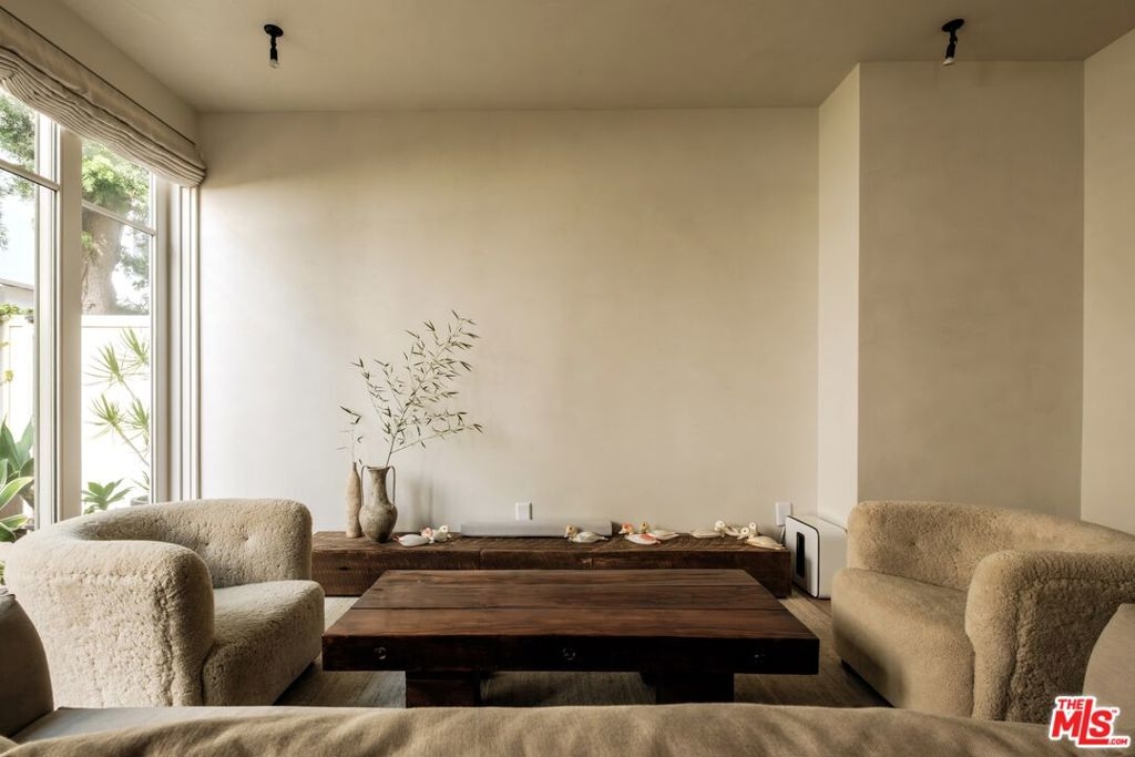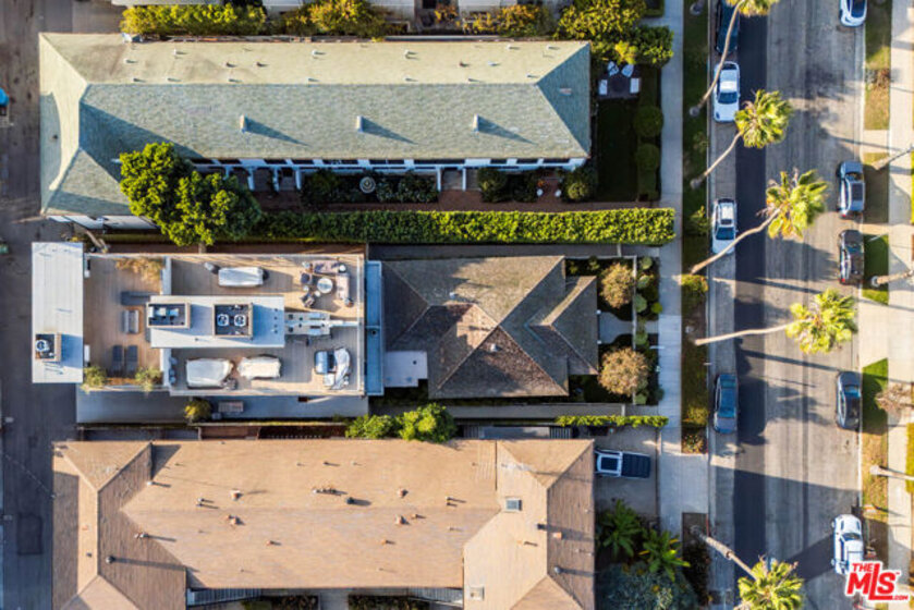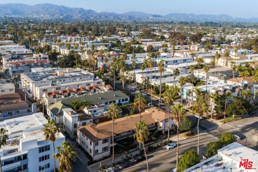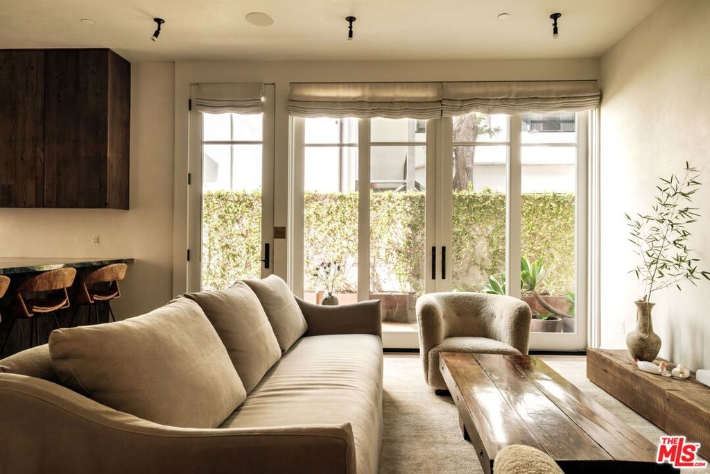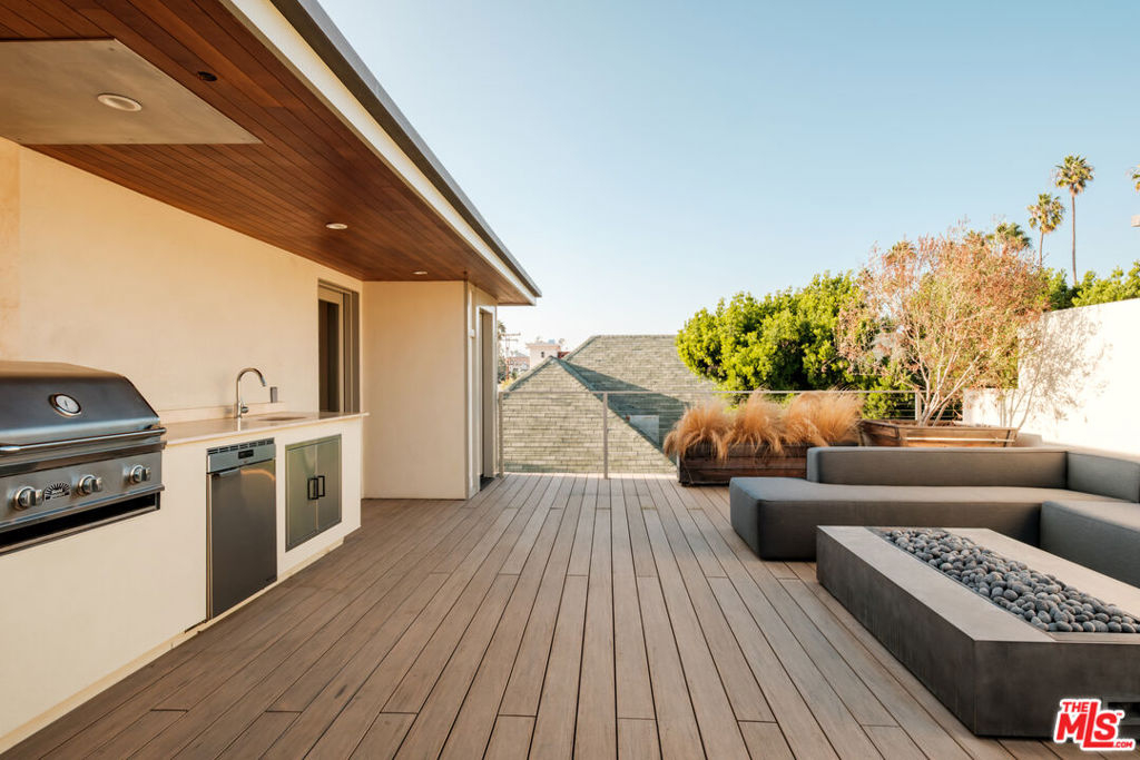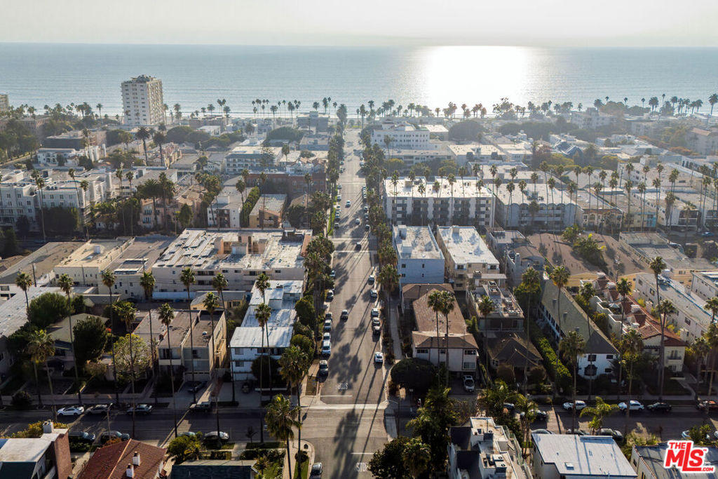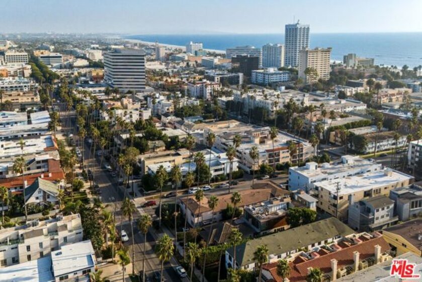 Built in 2018 and located just five blocks from Santa Monica Beach, this bright townhome blends thoughtful design with a private, multi-level layout. Executed by a renowned interior designer, the residence offers the option to be acquired furnished and styled. Custom hardware, paint treatments, furniture, and curated art complement pieces sourced from Europe, South America, and Los Angeles, resulting in a warm, balanced interior with intentional flow. From the two-car garage with built-in storage, private interior stairs lead to the main living level, where open living, dining, and kitchen spaces connect seamlessly. The living room features a Samsung ultra-short-throw smart laser home theater projector, while the kitchen is finished with distinctive cabinetry, a custom brass sink, Brazilian quartzite countertops, and a professional-grade Bertazzoni gas range. Also on this level is a bedroom currently configured as a home office with built-in cabinetry and furnishings, easily convertible back to a bedroom if desired. A full bathroom with a Belgian limestone sink, travertine tub, and contemporary shower completes the floor. A second staircase leads to the upper level, where the primary suite and an additional bedroom are positioned. The primary bedroom features floor-to-ceiling sliding doors and windows, two closets including a walk-in, and an en-suite bathroom with double sinks and Waterworks fixtures. The secondary bedroom also includes its own en-suite bathroom and abundant natural light from an oversized window. Above, a private rooftop deck of approximately 750 square feet extends the living space outdoors, offering city and mountain views. The deck is equipped with a Sol built-in BBQ, Brown and Jordan fire table, and integrated Sonos sound system well suited for both entertaining and everyday use. Located within the Roosevelt Elementary School district and moments from Montana Avenue's shops and dining, with the beach just five blocks away. List price is for the unfurnished home. Furniture may be available separately.