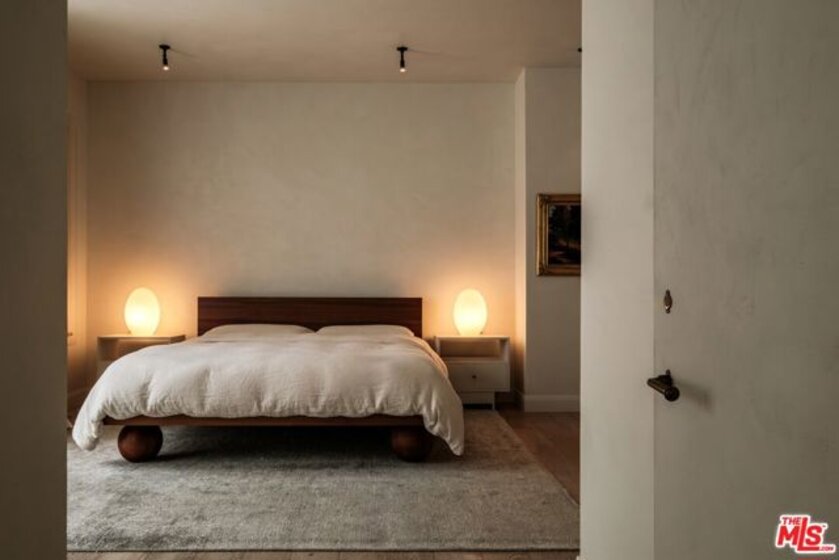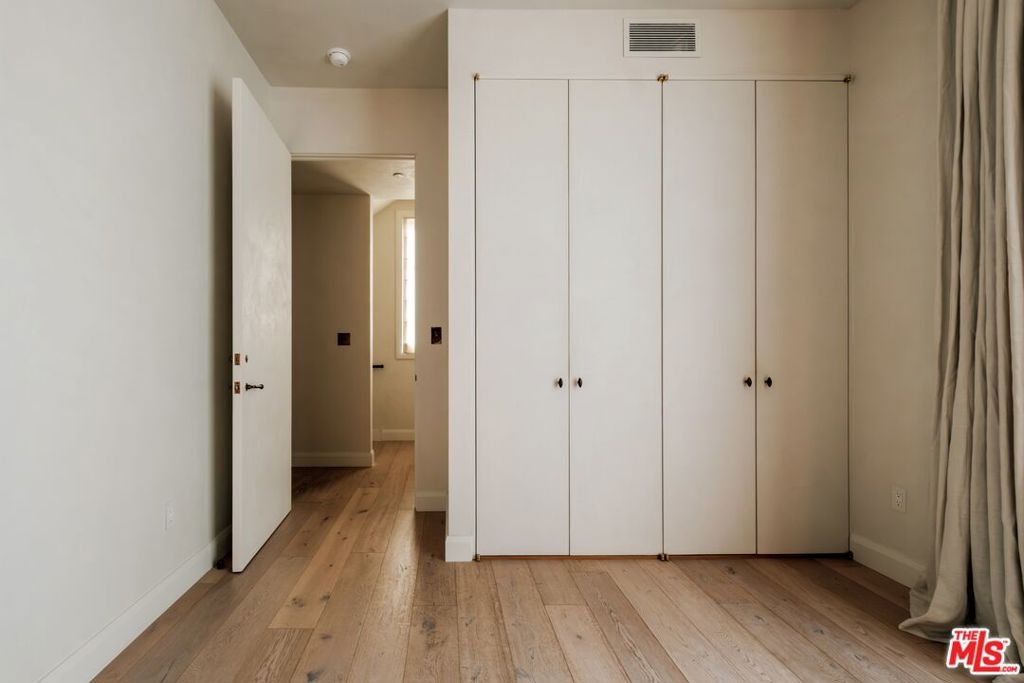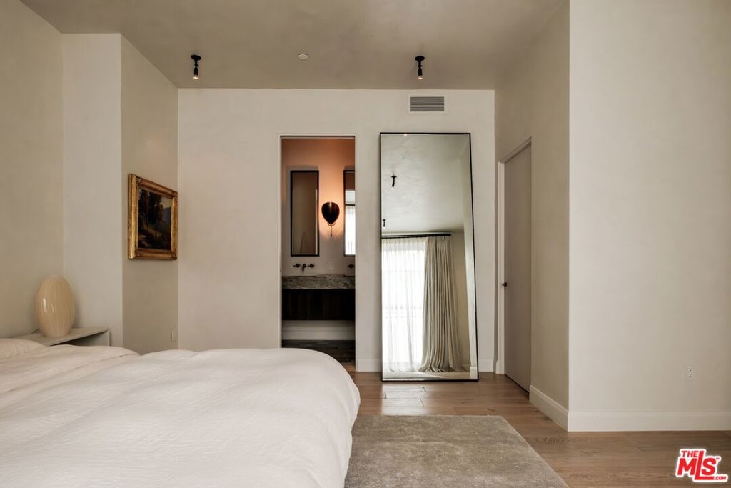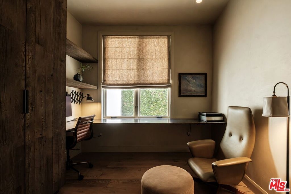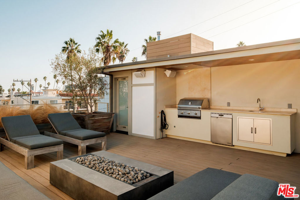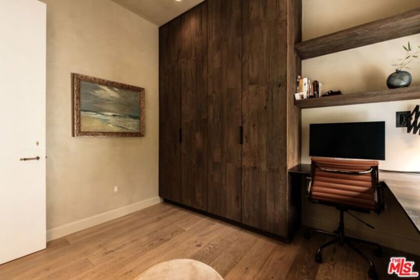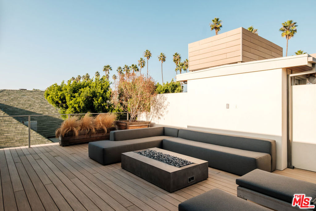 Built in 2018 and located just five blocks from Santa Monica Beach, this bright townhome blends thoughtful design with a private, multi-level layout. Executed by a renowned interior designer, the residence offers the option to be acquired furnished and styled. Custom hardware, paint treatments, furniture, and curated art complement pieces sourced from Europe, South America, and Los Angeles, resulting in a warm, balanced interior with intentional flow. From the two-car garage with built-in storage, private interior stairs lead to the main living level, where open living, dining, and kitchen spaces connect seamlessly. The living room features a Samsung ultra-short-throw smart laser home theater projector, while the kitchen is finished with distinctive cabinetry, a custom brass sink, Brazilian quartzite countertops, and a professional-grade Bertazzoni gas range. Also on this level is a bedroom currently configured as a home office with built-in cabinetry and furnishings, easily convertible back to a bedroom if desired. A full bathroom with a Belgian limestone sink, travertine tub, and contemporary shower completes the floor. A second staircase leads to the upper level, where the primary suite and an additional bedroom are positioned. The primary bedroom features floor-to-ceiling sliding doors and windows, two closets including a walk-in, and an en-suite bathroom with double sinks and Waterworks fixtures. The secondary bedroom also includes its own en-suite bathroom and abundant natural light from an oversized window. Above, a private rooftop deck of approximately 750 square feet extends the living space outdoors, offering city and mountain views. The deck is equipped with a Sol built-in BBQ, Brown and Jordan fire table, and integrated Sonos sound system well suited for both entertaining and everyday use. Located within the Roosevelt Elementary School district and moments from Montana Avenue's shops and dining, with the beach just five blocks away. List price is for the unfurnished home. Furniture may be available separately.
