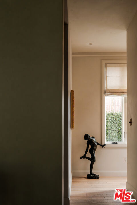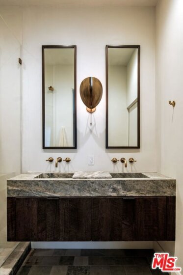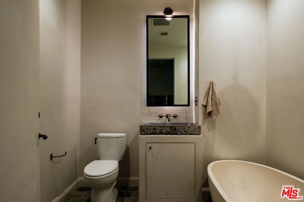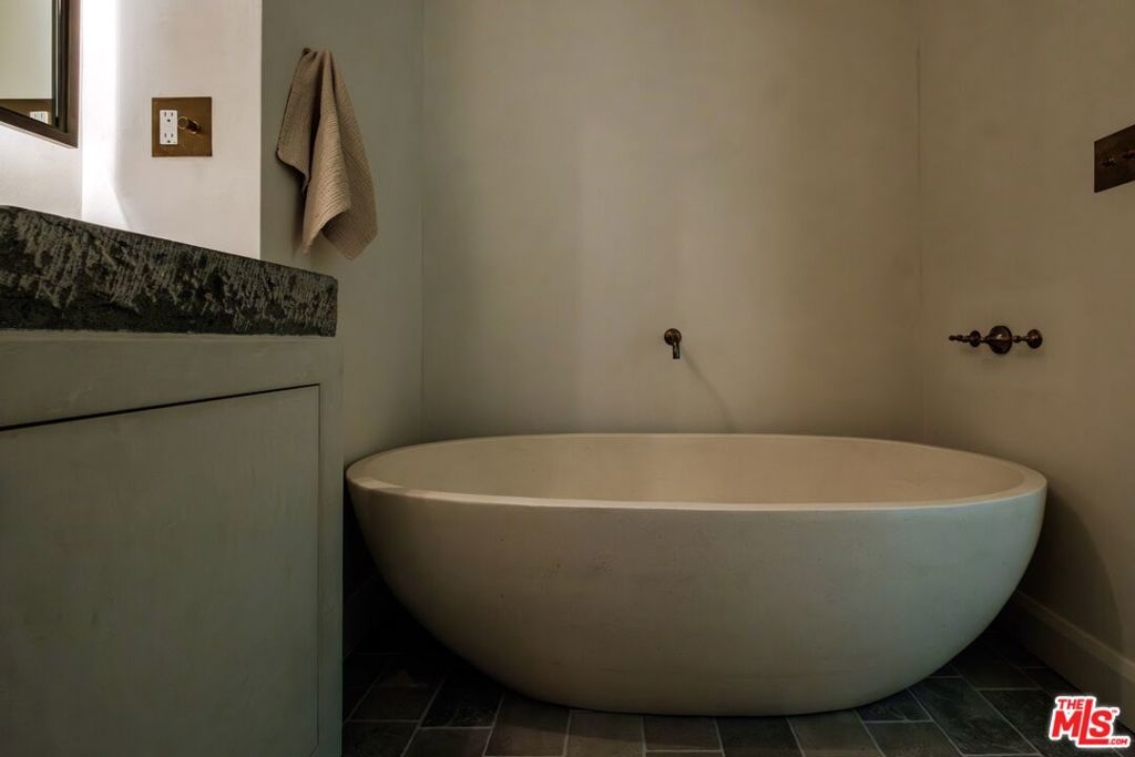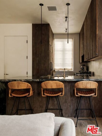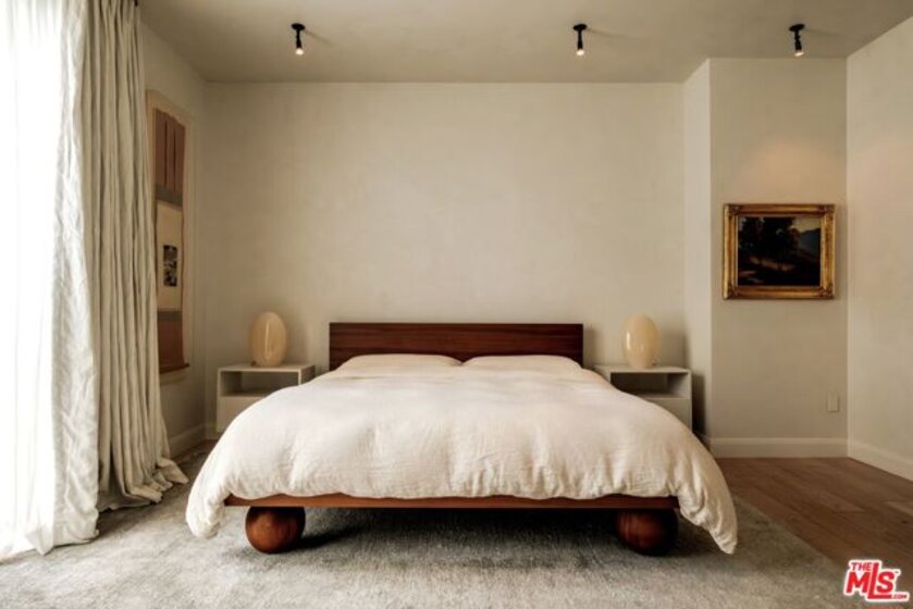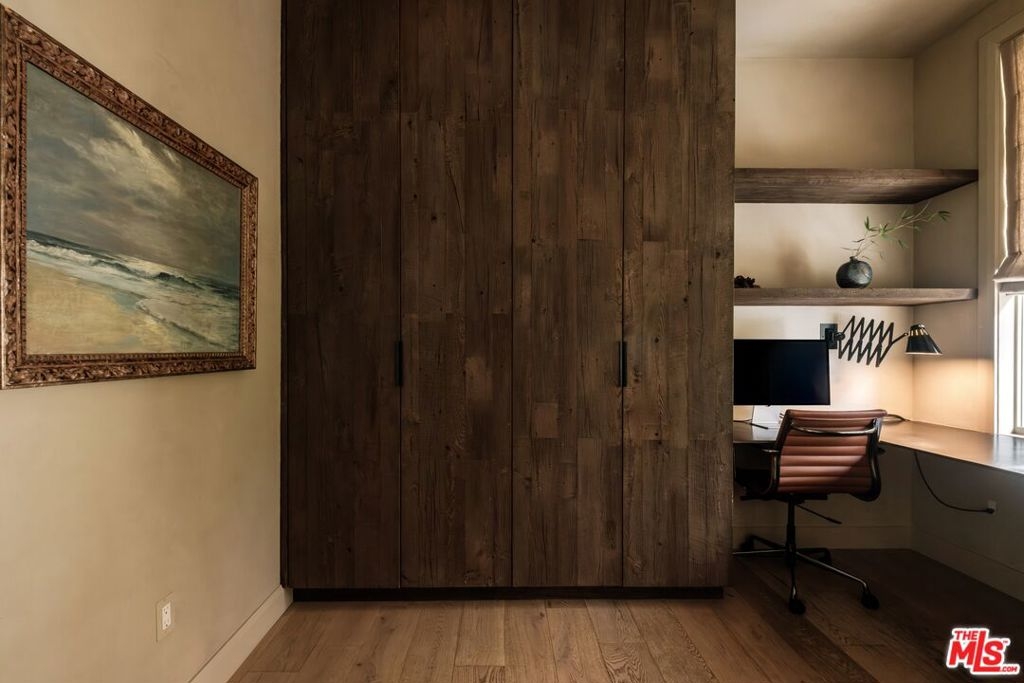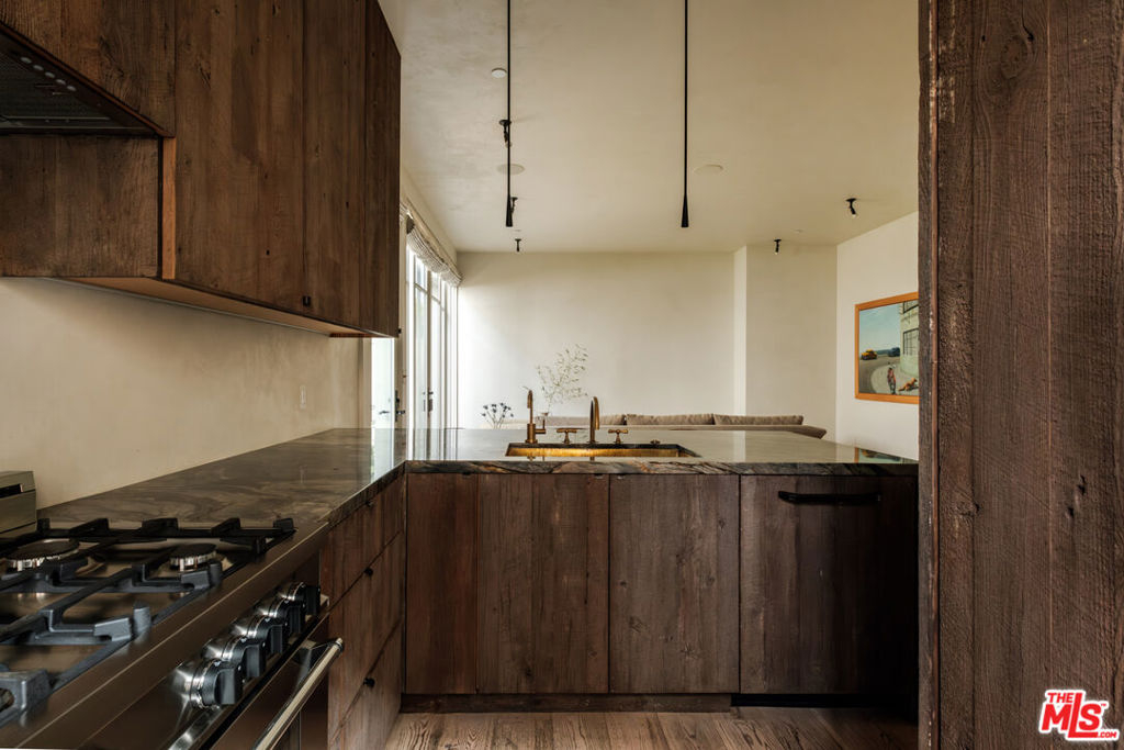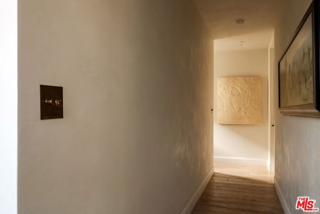 Built in 2018 and located just five blocks from Santa Monica Beach, this bright townhome blends thoughtful design with a private, multi-level layout. Executed by a renowned interior designer, the residence offers the option to be acquired furnished and styled. Custom hardware, paint treatments, furniture, and curated art complement pieces sourced from Europe, South America, and Los Angeles, resulting in a warm, balanced interior with intentional flow. From the two-car garage with built-in storage, private interior stairs lead to the main living level, where open living, dining, and kitchen spaces connect seamlessly. The living room features a Samsung ultra-short-throw smart laser home theater projector, while the kitchen is finished with distinctive cabinetry, a custom brass sink, Brazilian quartzite countertops, and a professional-grade Bertazzoni gas range. Also on this level is a bedroom currently configured as a home office with built-in cabinetry and furnishings, easily convertible back to a bedroom if desired. A full bathroom with a Belgian limestone sink, travertine tub, and contemporary shower completes the floor. A second staircase leads to the upper level, where the primary suite and an additional bedroom are positioned. The primary bedroom features floor-to-ceiling sliding doors and windows, two closets including a walk-in, and an en-suite bathroom with double sinks and Waterworks fixtures. The secondary bedroom also includes its own en-suite bathroom and abundant natural light from an oversized window. Above, a private rooftop deck of approximately 750 square feet extends the living space outdoors, offering city and mountain views. The deck is equipped with a Sol built-in BBQ, Brown and Jordan fire table, and integrated Sonos sound system well suited for both entertaining and everyday use. Located within the Roosevelt Elementary School district and moments from Montana Avenue's shops and dining, with the beach just five blocks away. List price is for the unfurnished home. Furniture may be available separately.